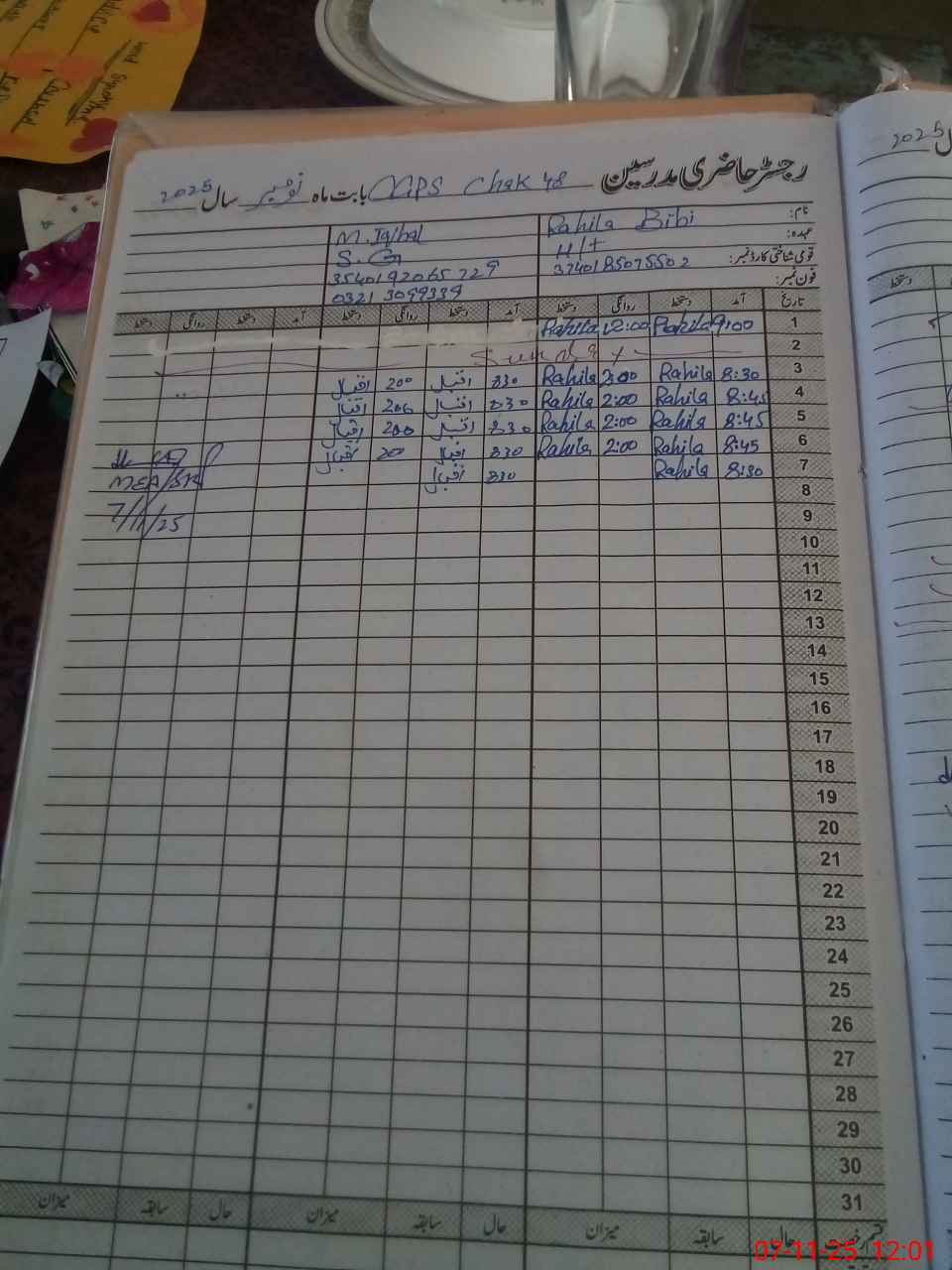 | CNIC | Full Name | Designation | R/C | Absence During Last Calender Month |