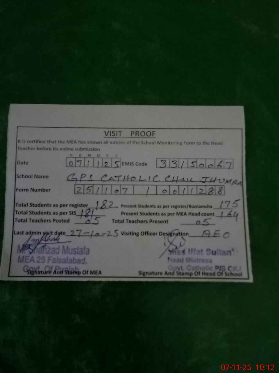 | Attendance Register | Head Teacher | MEA with School | Visit Proof |