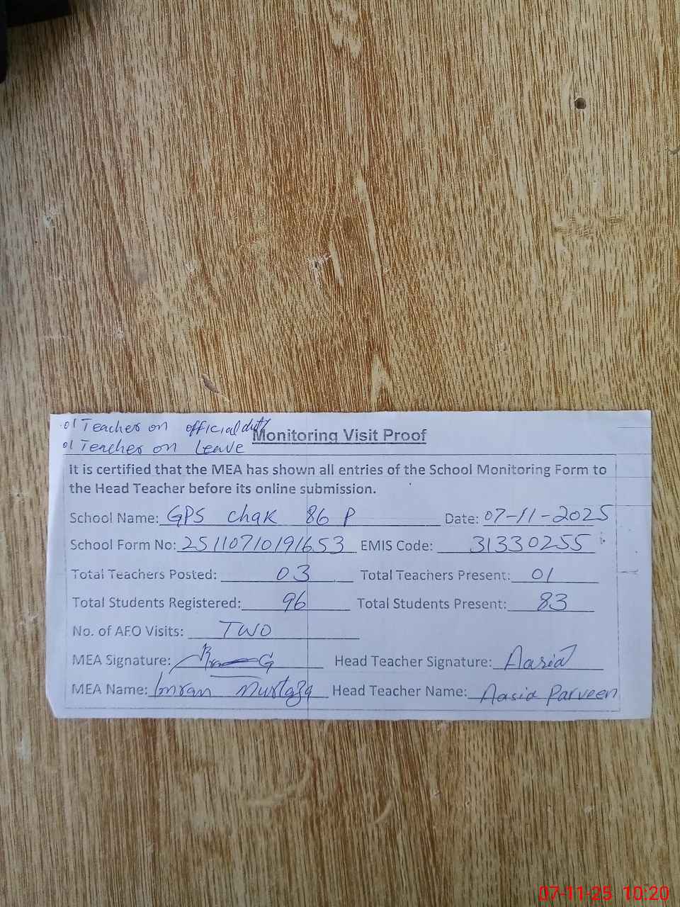 | EMIS Code: 31330255 | Name of School: GPS CHAK 86/P | |||