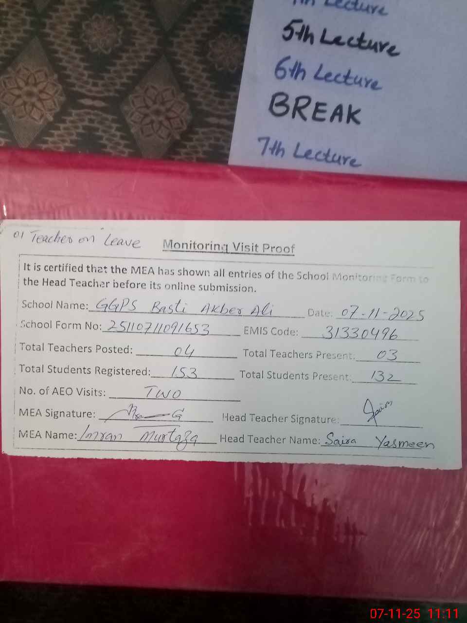 | Attendance Register | Head Teacher | MEA with School | Visit Proof |