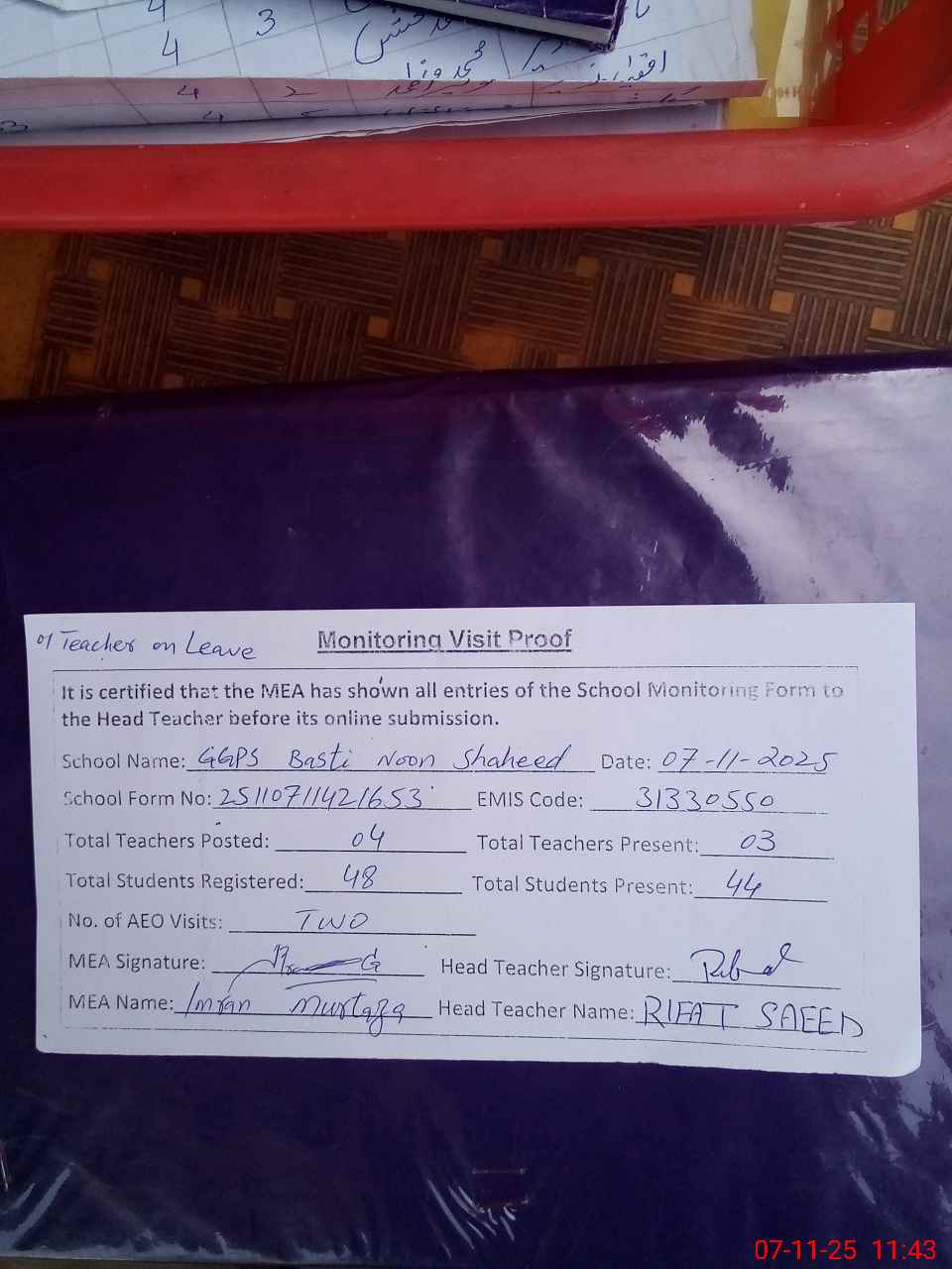 | Attendance Register | Head Teacher | MEA with School | Visit Proof |