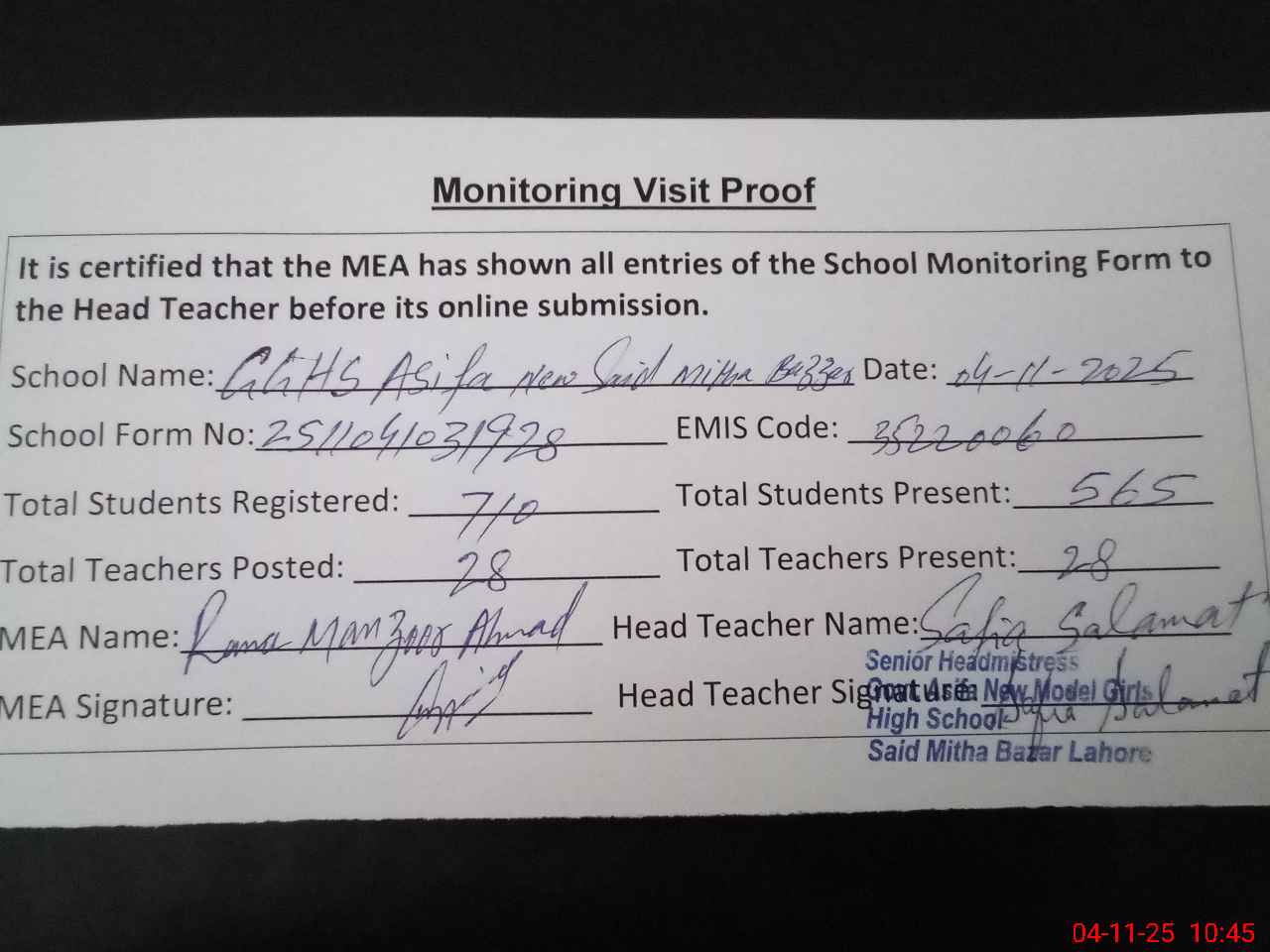 | Monitoring Date: 04-11-2025 | Start Time: 04-11-2025 10:04 AM | End Time: 04-11-2025 10:54 AM | Name of MEA: Ra**** Ma**** Ah**** | |