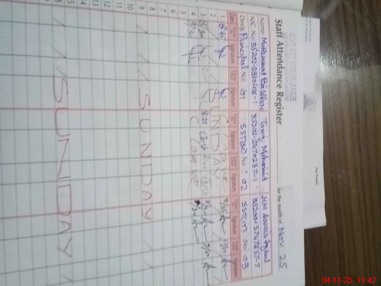 | CNIC | Full Name | Designation | R/C | Absence During Last Calender Month |