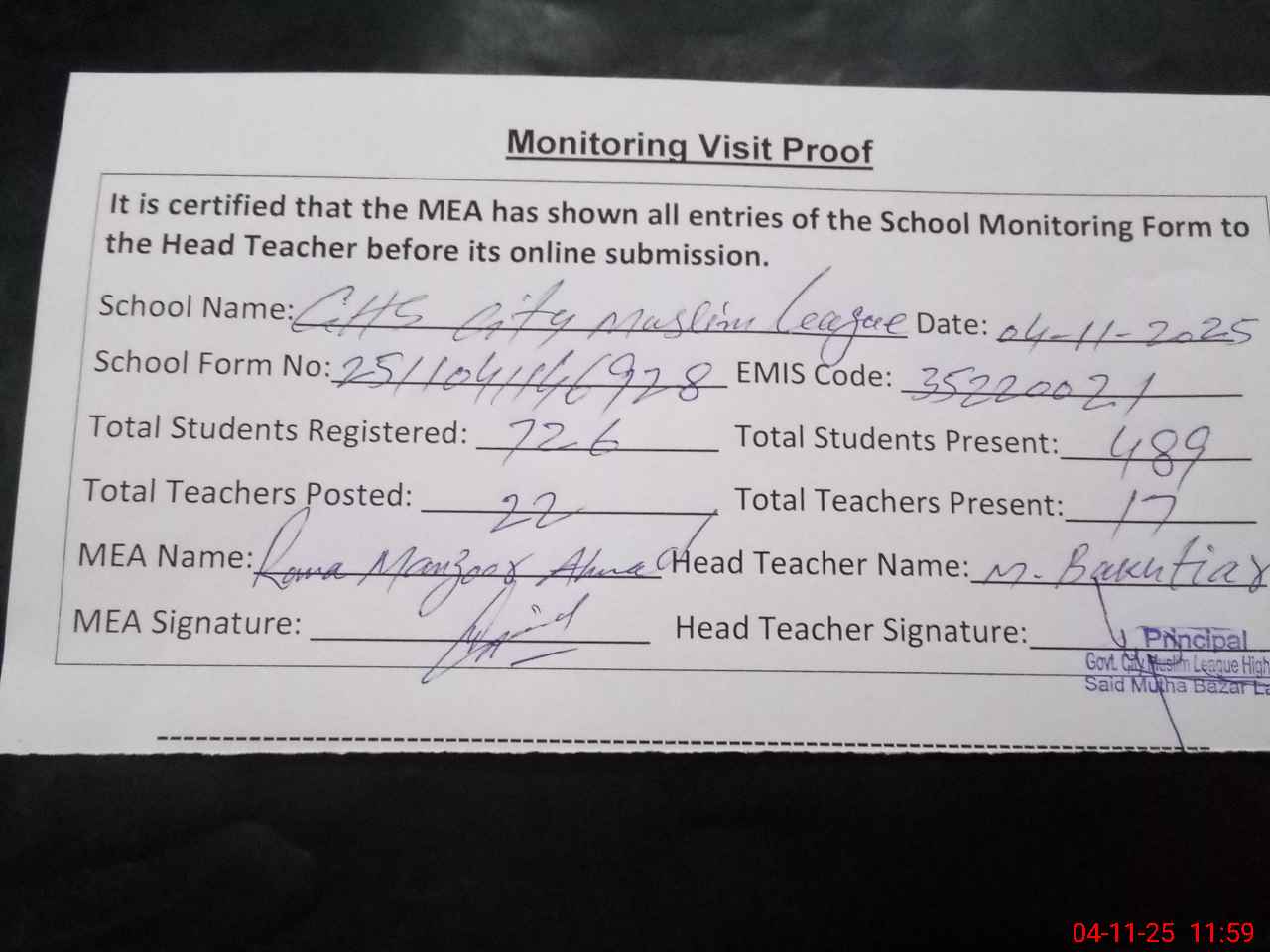 | Attendance Register | Head Teacher | MEA with School | Visit Proof |