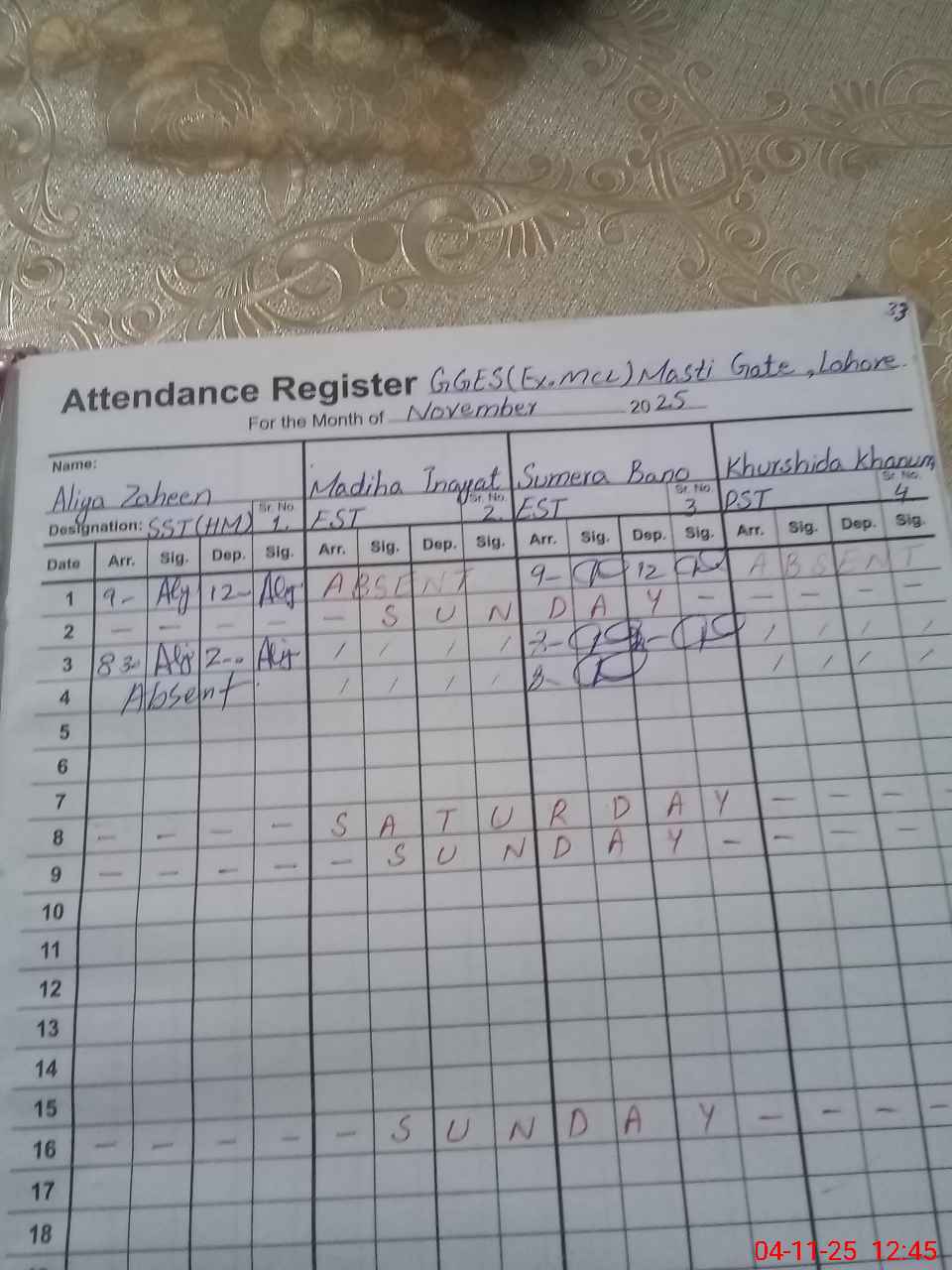 | Remarks (Use Separate Page if Required): SST Alia Zaheen EST Madiha Inayat and PST khurshida Khanum found absent today Head Mistress Alia Zaheen is habitual of absentee and late Coming | |||||