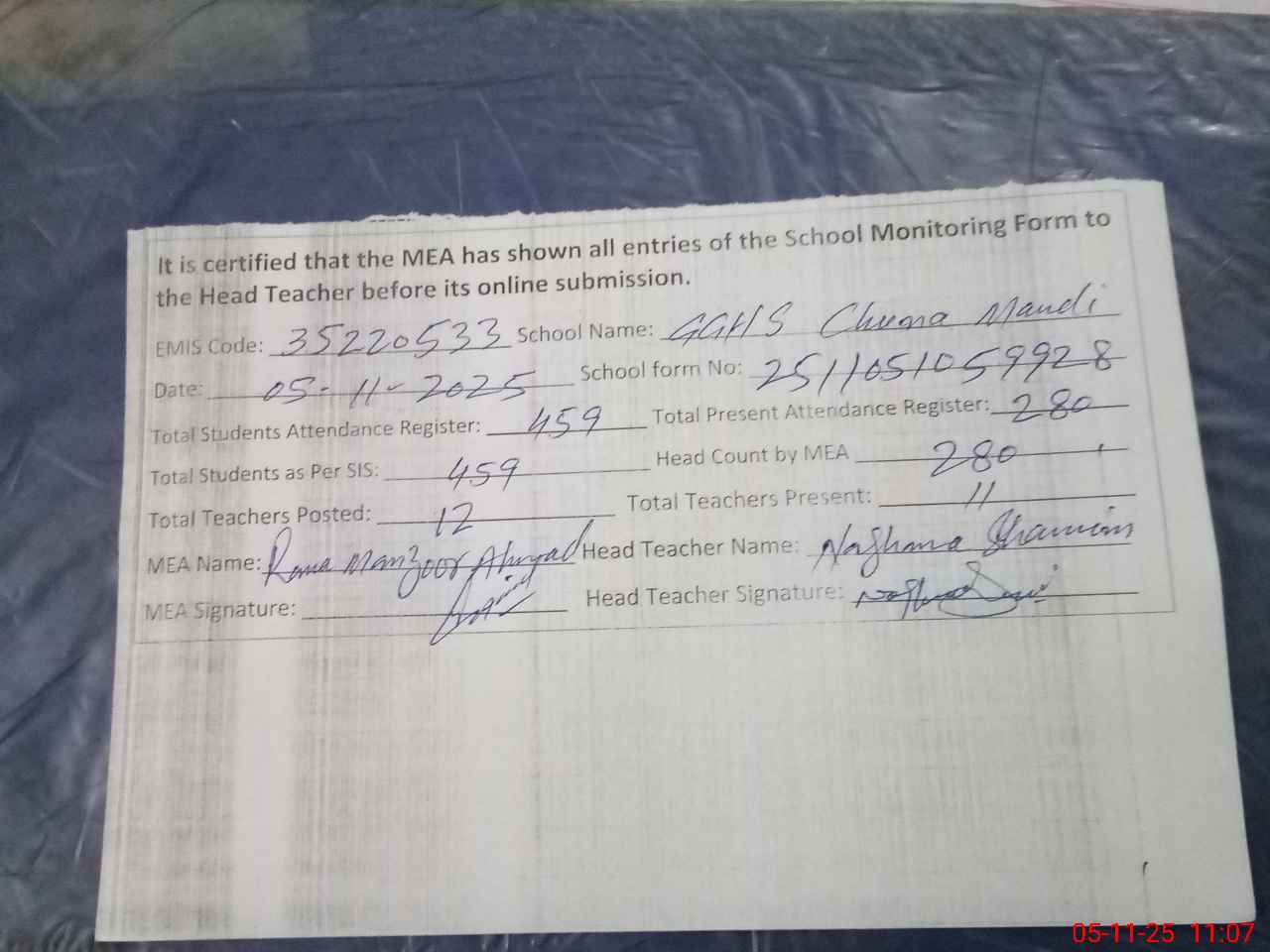 | Monitoring Date: 05-11-2025 | Start Time: 05-11-2025 09:34 AM | End Time: 05-11-2025 11:10 AM | Name of MEA: Ra**** Ma**** Ah**** | |