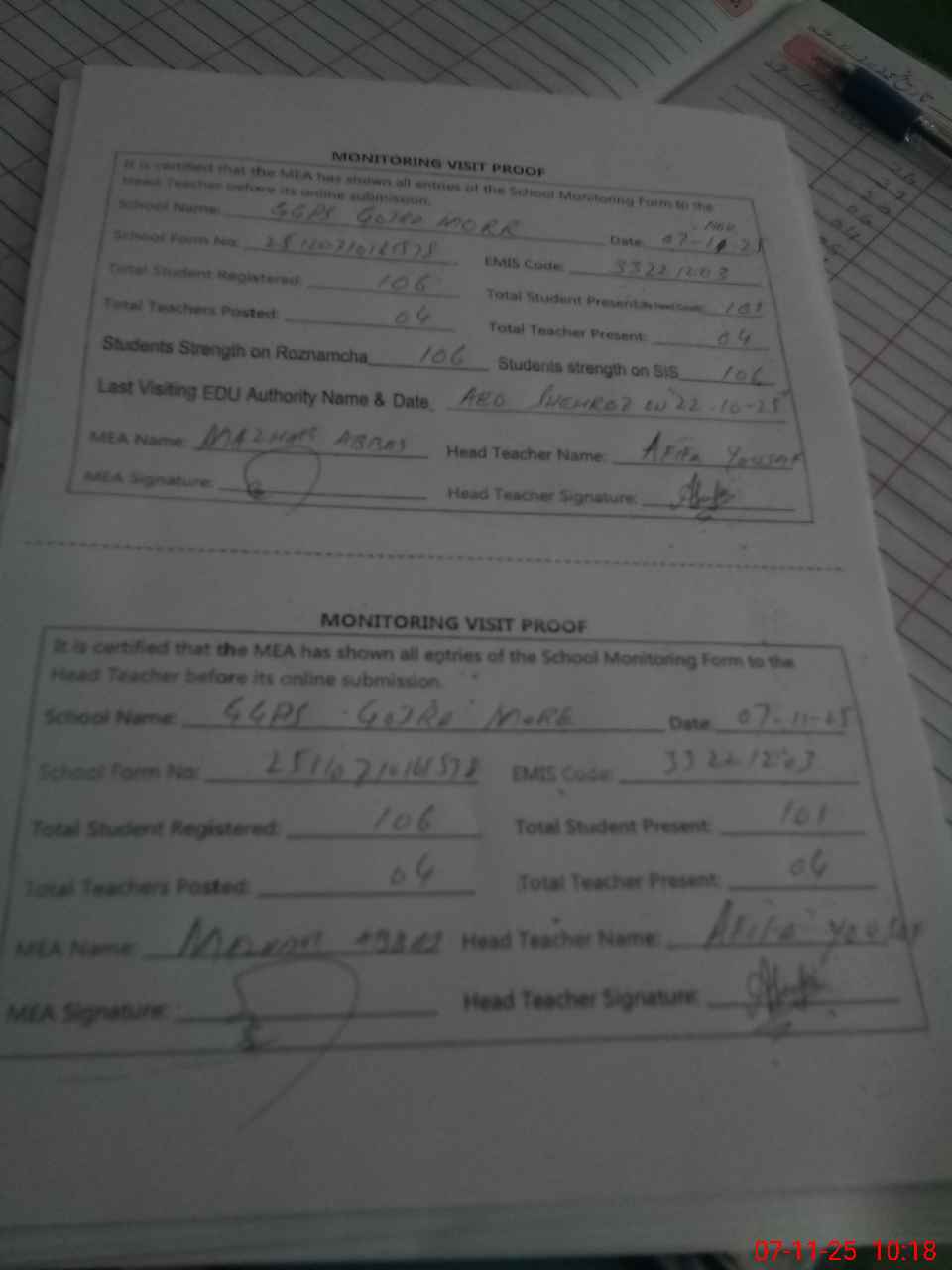| Attendance Register | Head Teacher | MEA with School | Visit Proof |