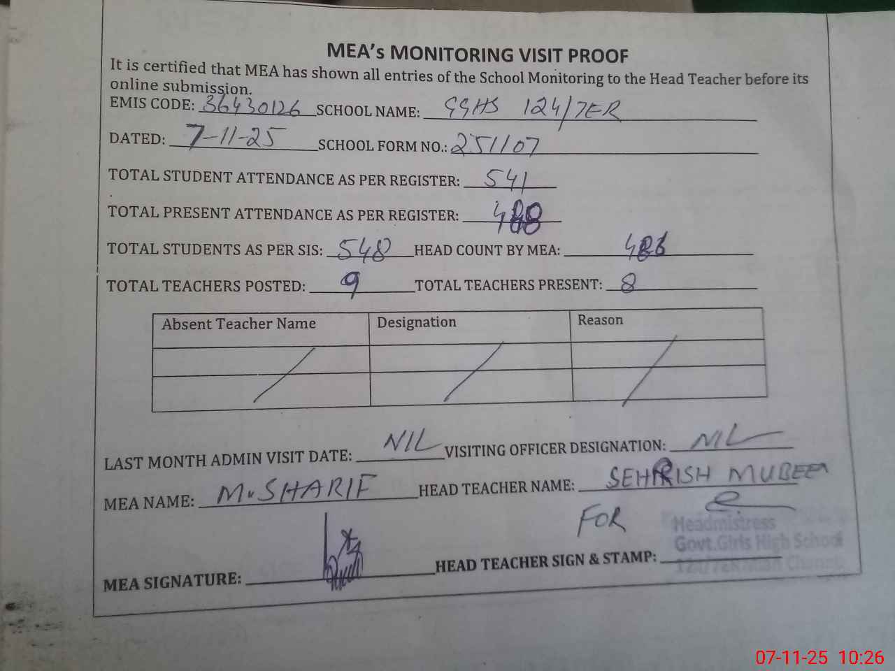 | EMIS Code: 36430126 | Name of School: GGHS 124/7-ER TULAMBA | |||
