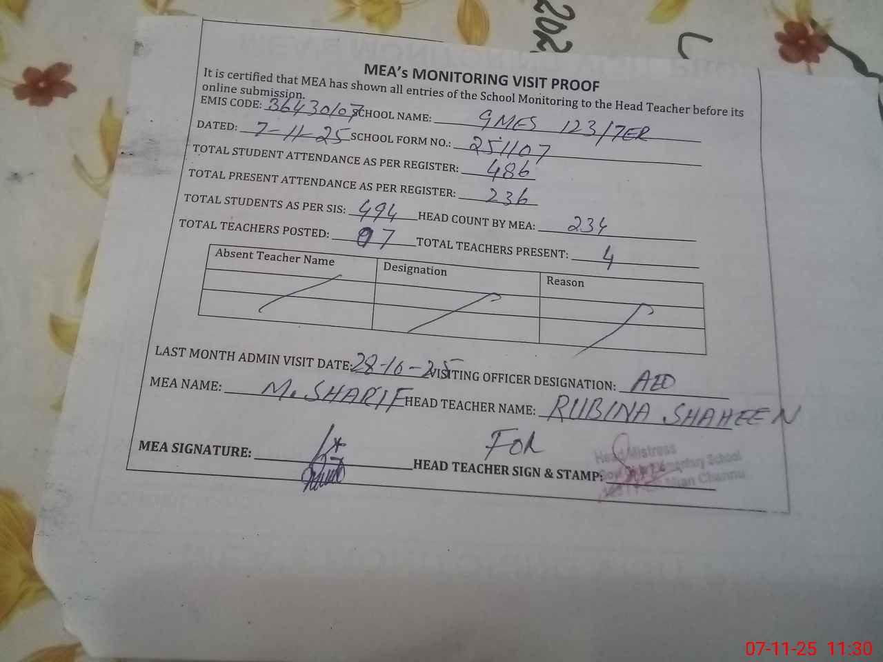 | Attendance Register | Head Teacher | MEA with School | Visit Proof |