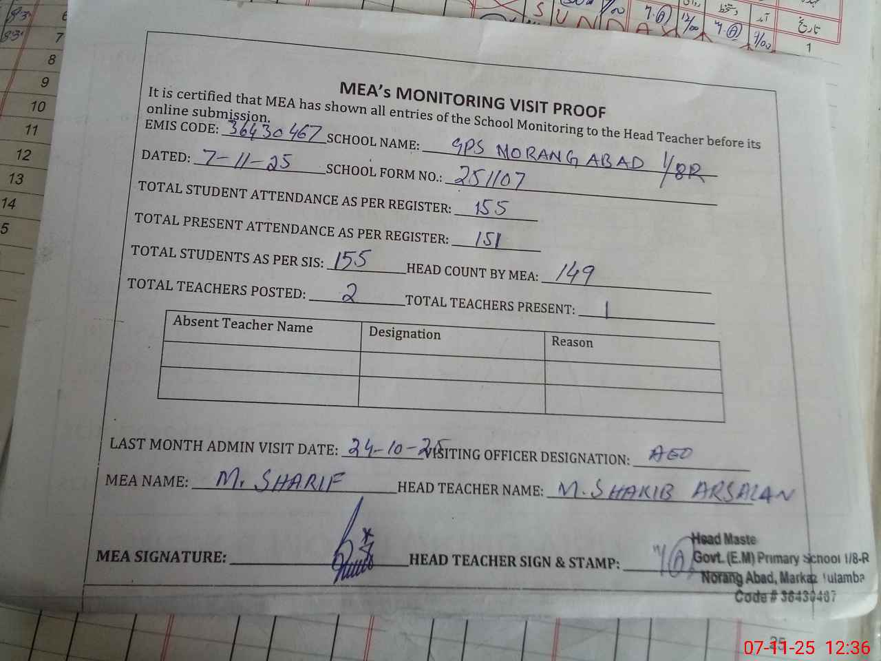 | Attendance Register | Head Teacher | MEA with School | Visit Proof |