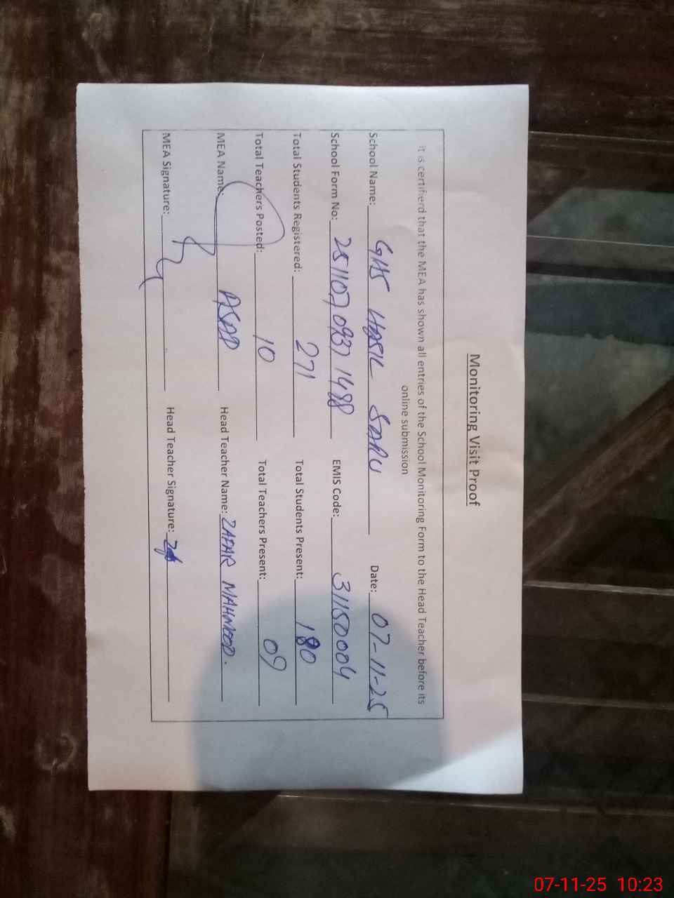 | Attendance Register | Head Teacher | MEA with School | Visit Proof |