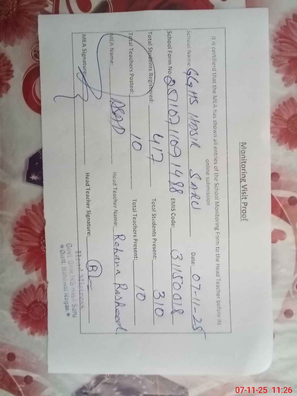 | Attendance Register | Head Teacher | MEA with School | Visit Proof |