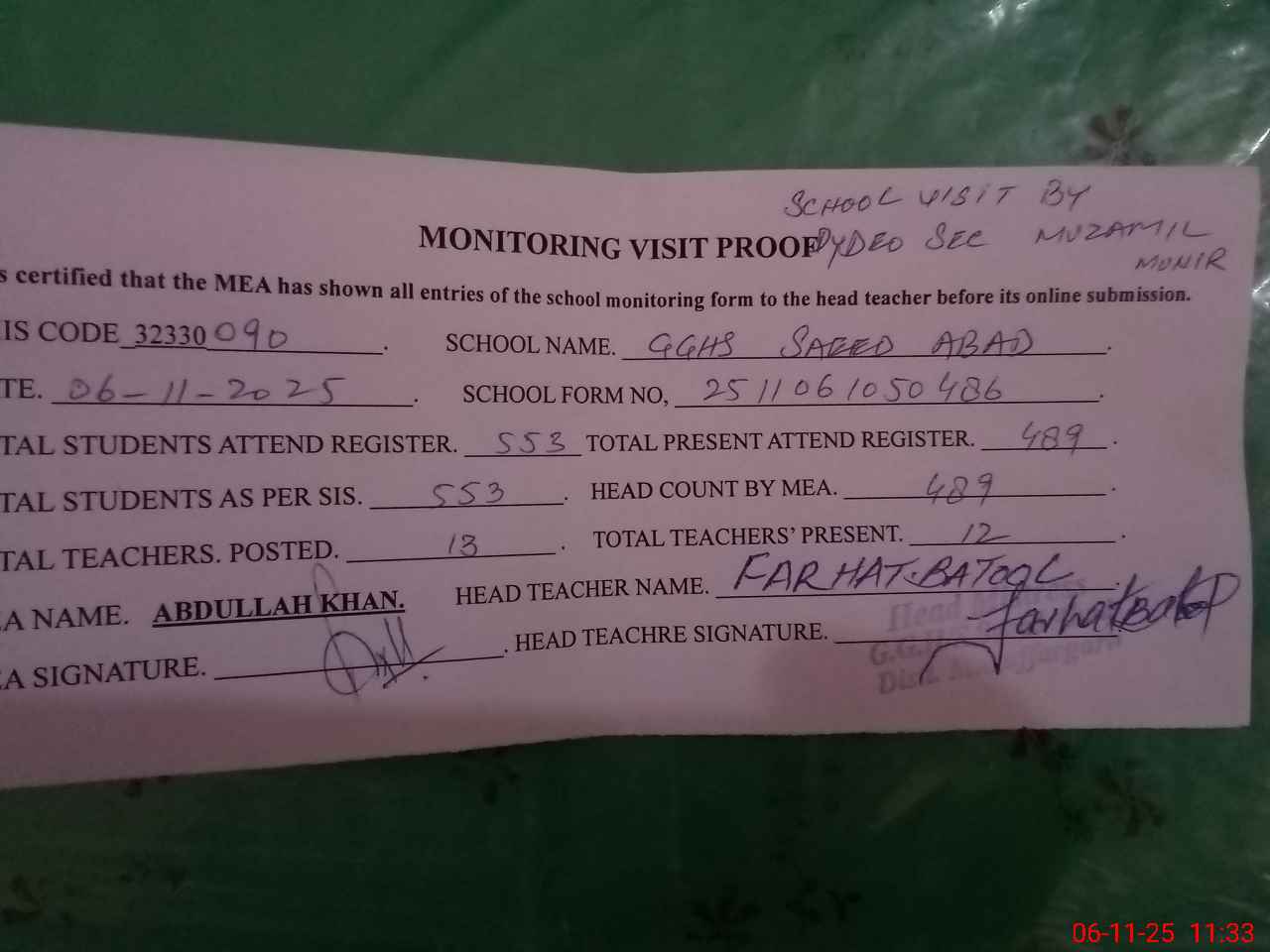 | EMIS Code: 32330090 | Name of School: GGHS SAEED ABAD | |||