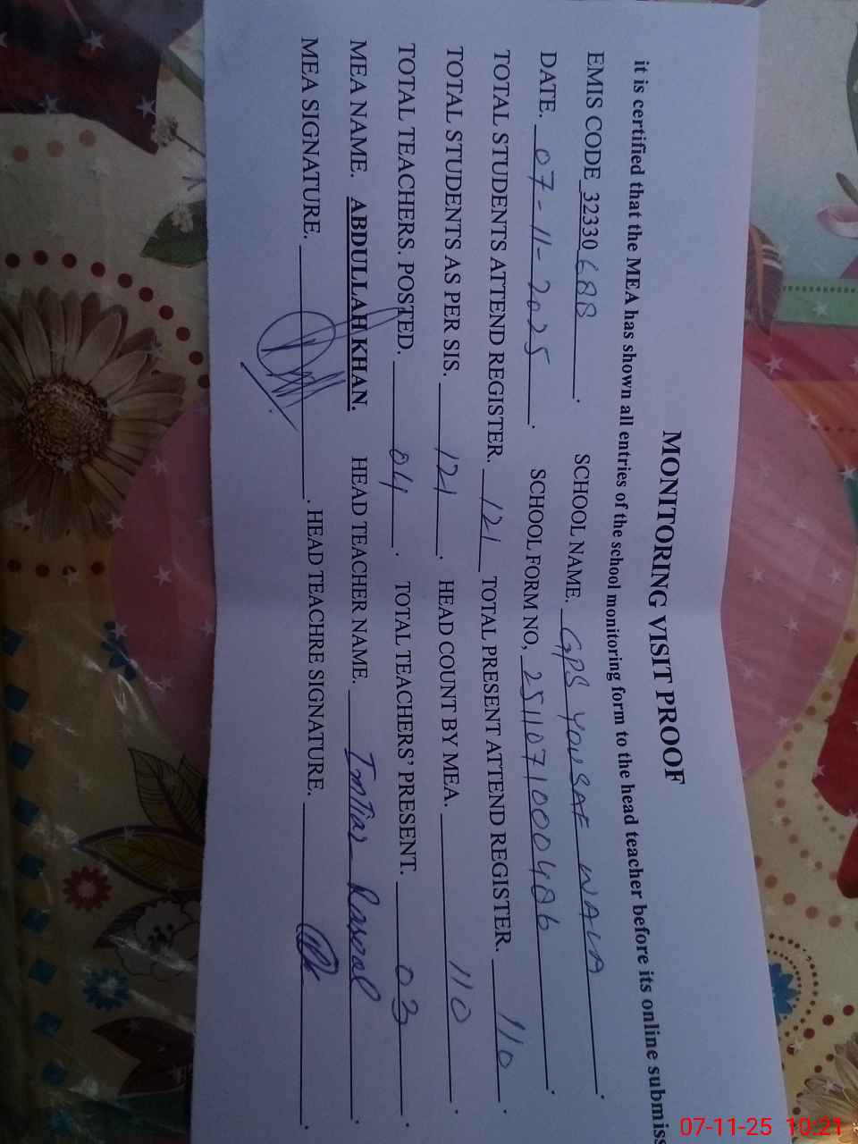 | Attendance Register | Head Teacher | MEA with School | Visit Proof |