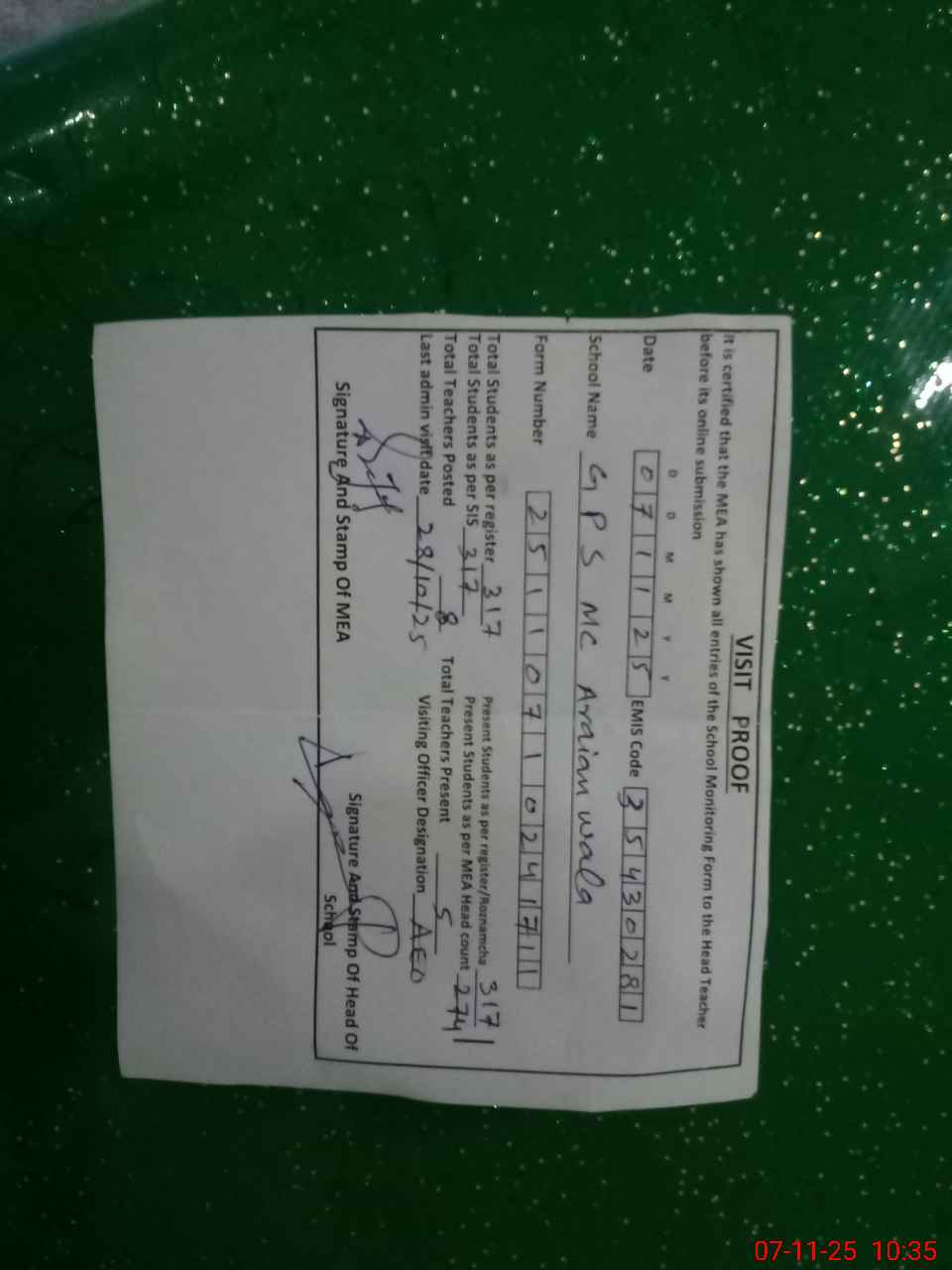 | Attendance Register | Head Teacher | MEA with School | Visit Proof |