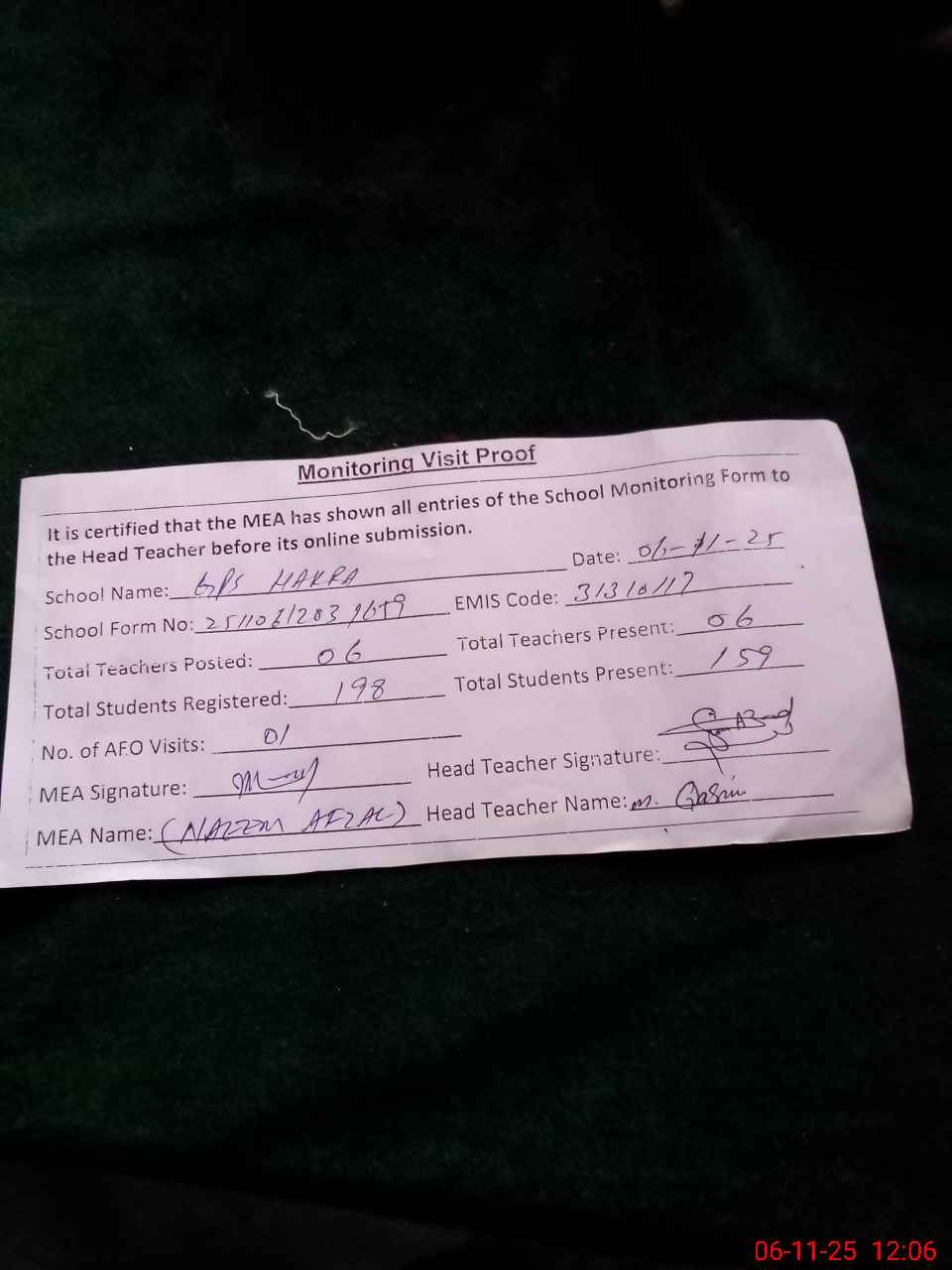 | Attendance Register | Head Teacher | MEA with School | Visit Proof |