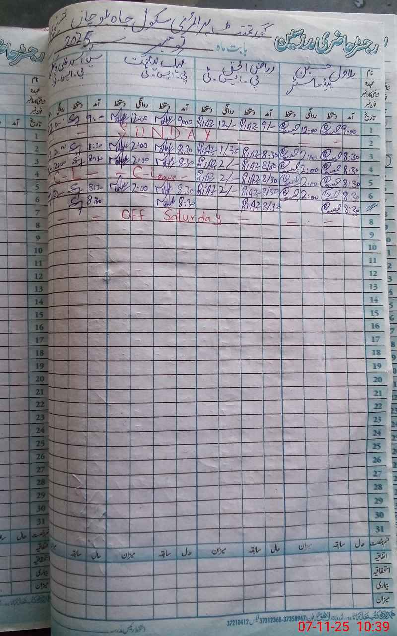 | CNIC | Full Name | Designation | R/C | Absence During Last Calender Month |