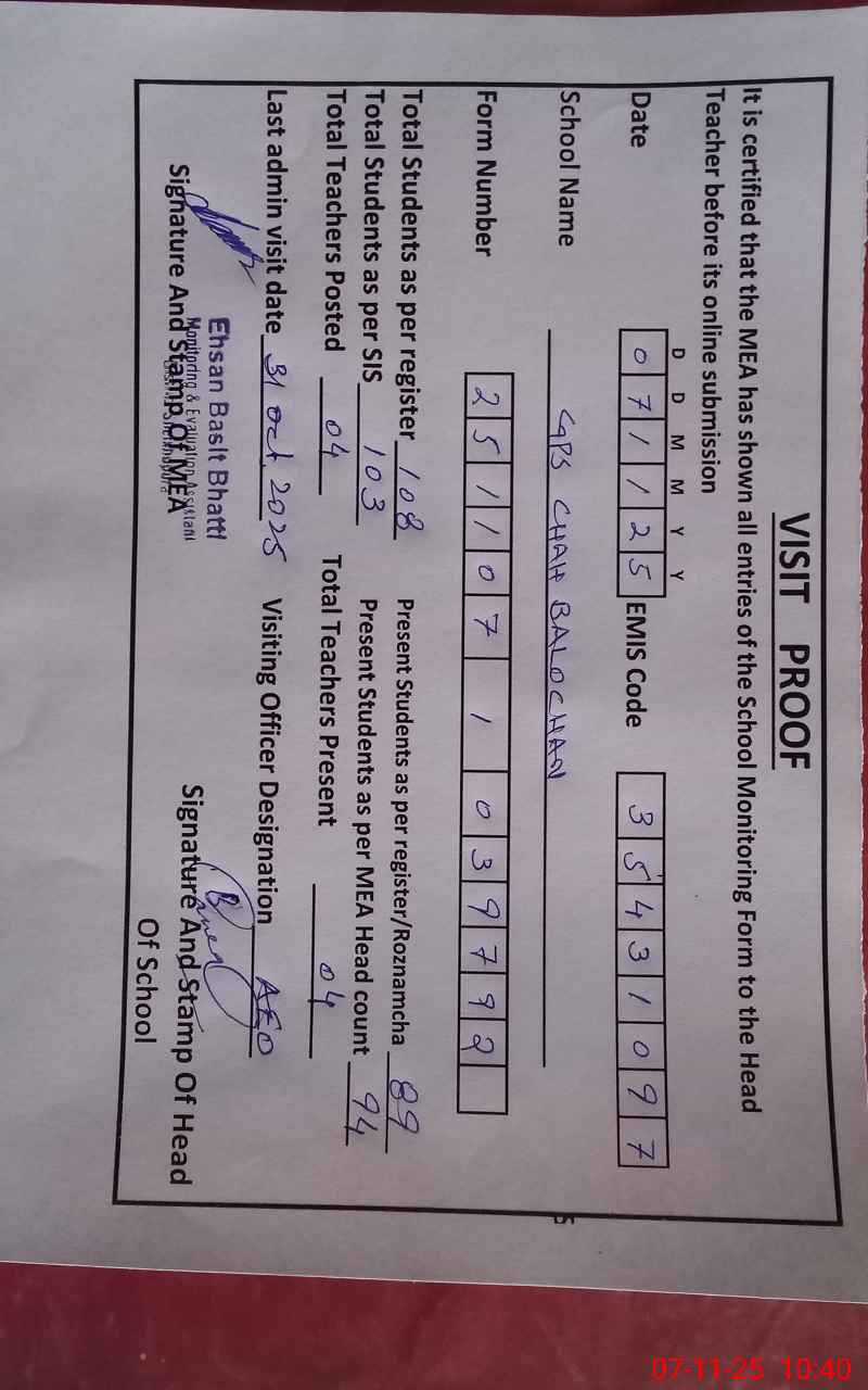 | EMIS Code: 35431097 | Name of School: GPS CHAH BALOCHAN | |||