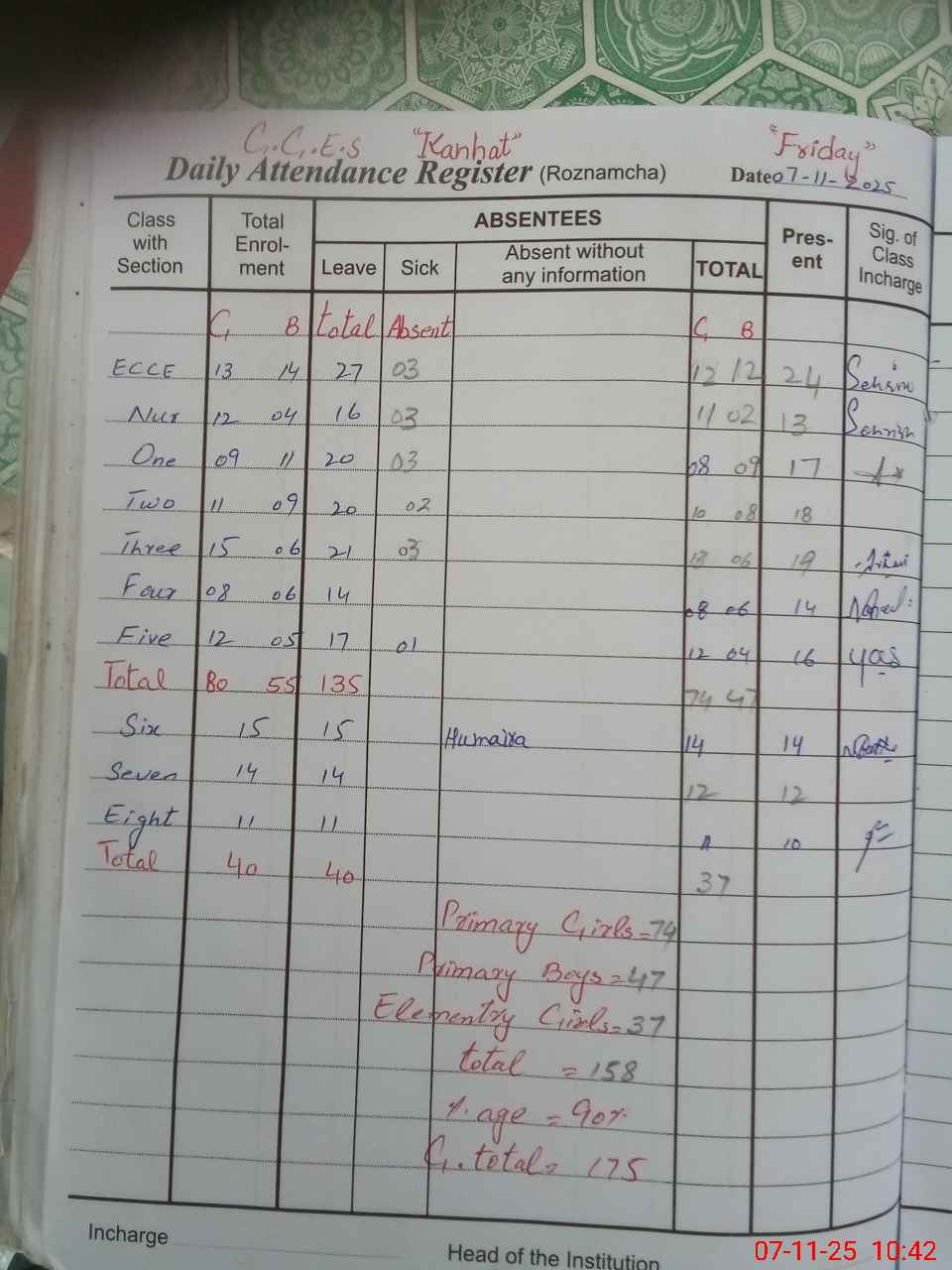| Attendance Register | Head Teacher | MEA with School | Visit Proof |