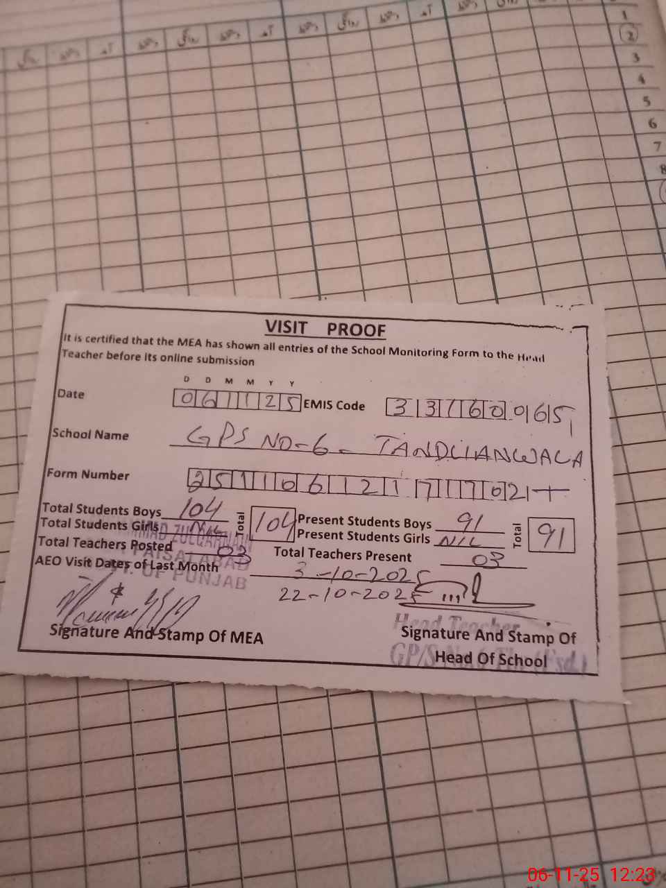 | EMIS Code: 33160065 | Name of School: GPS NO 6 TANDLIANWALA | |||