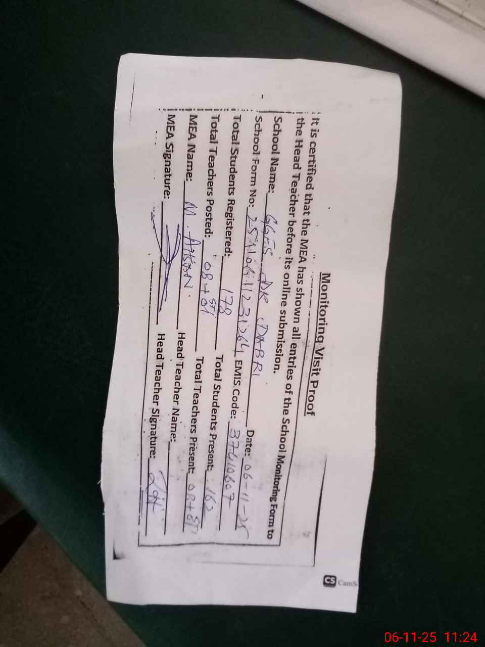 | Attendance Register | Head Teacher | MEA with School | Visit Proof |