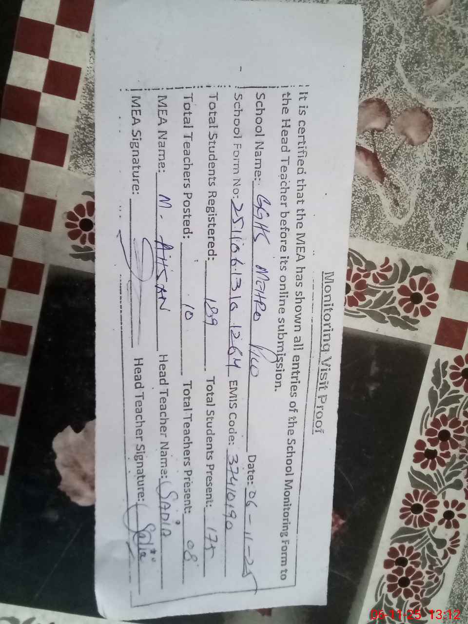 | Certified that this School was Inspected by the Undersigned MEA/DMO Today and the Information Stated Above is as Per Record. | |||||