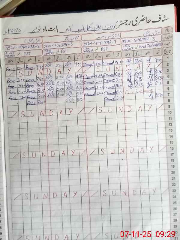 | CNIC | Full Name | Designation | R/C | Absence During Last Calender Month |