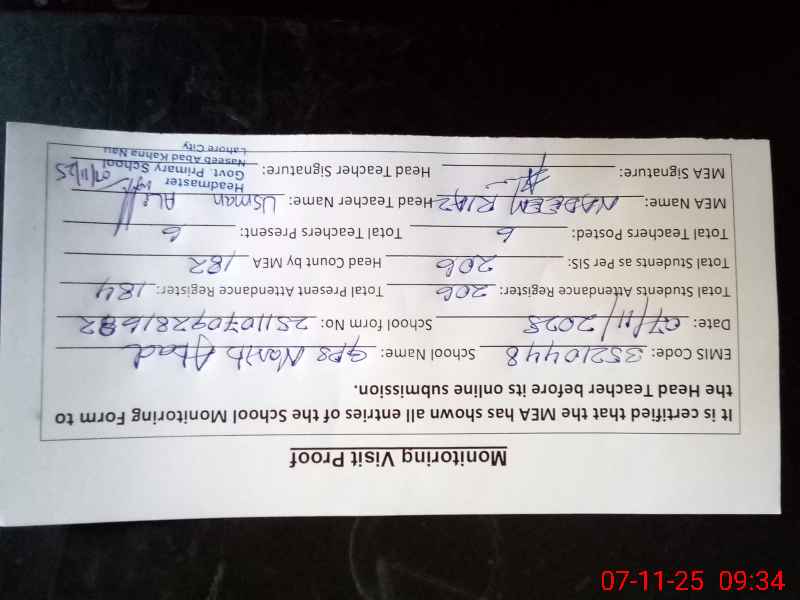 | Attendance Register | Head Teacher | MEA with School | Visit Proof |