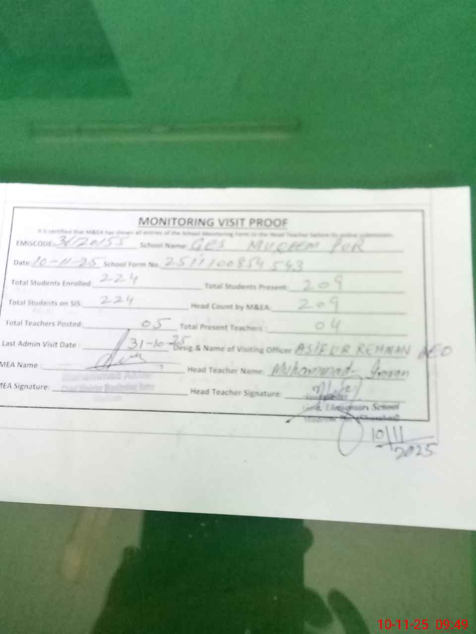 | Attendance Register | Head Teacher | MEA with School | Visit Proof |