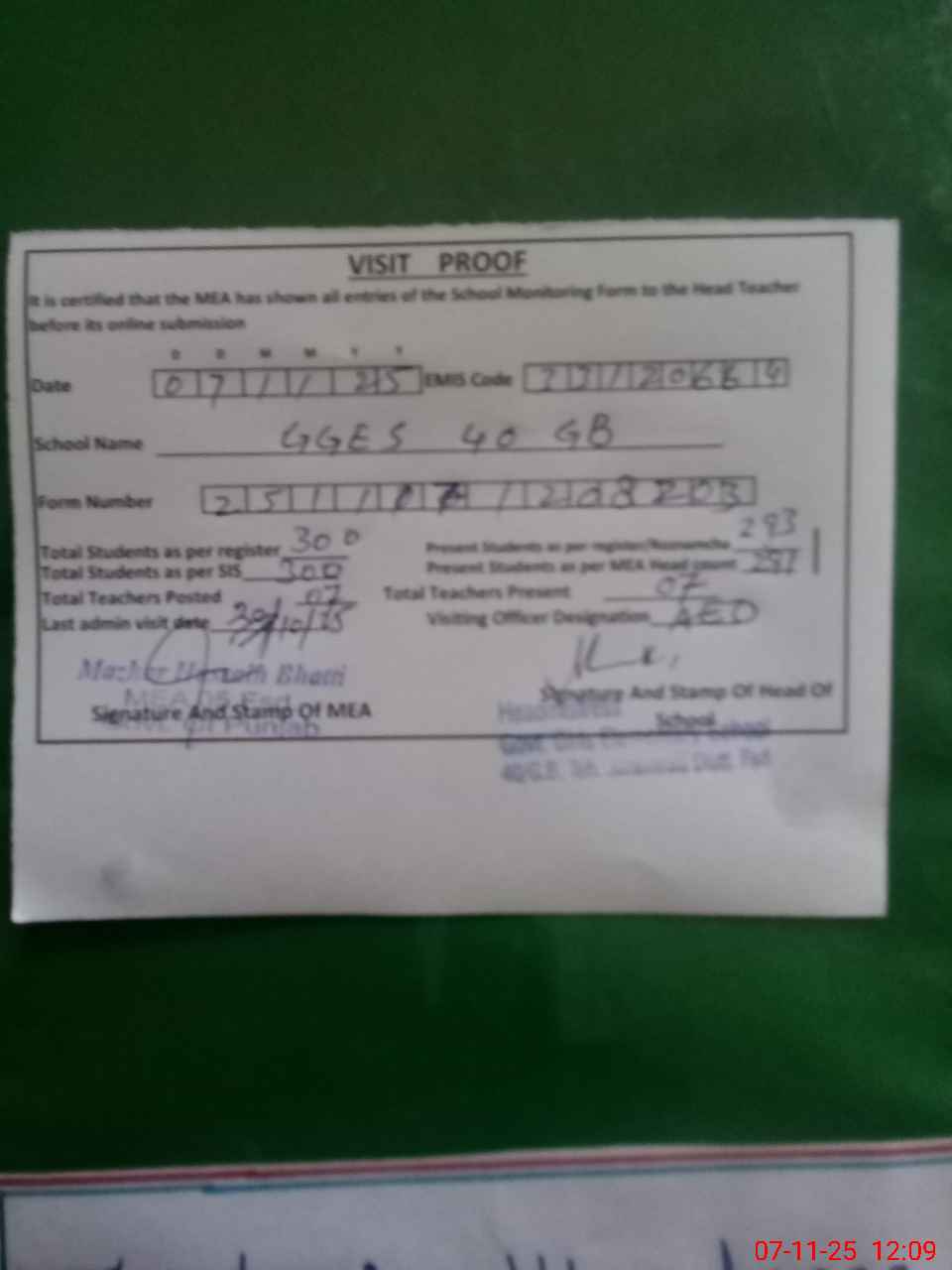 | EMIS Code: 33120664 | Name of School: GGES CHAK 40 GB SATIANA | |||