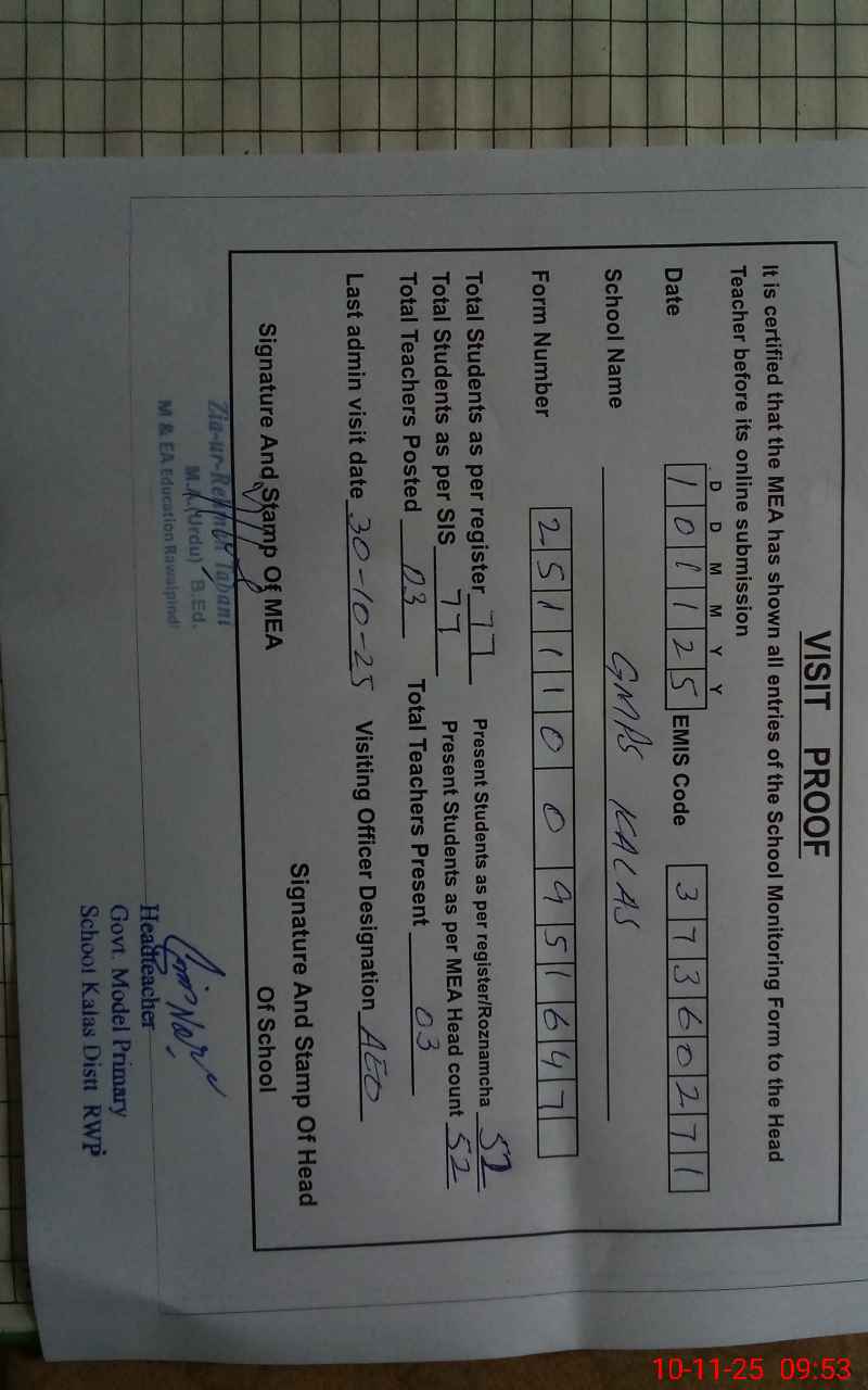 | Attendance Register | Head Teacher | MEA with School | Visit Proof |