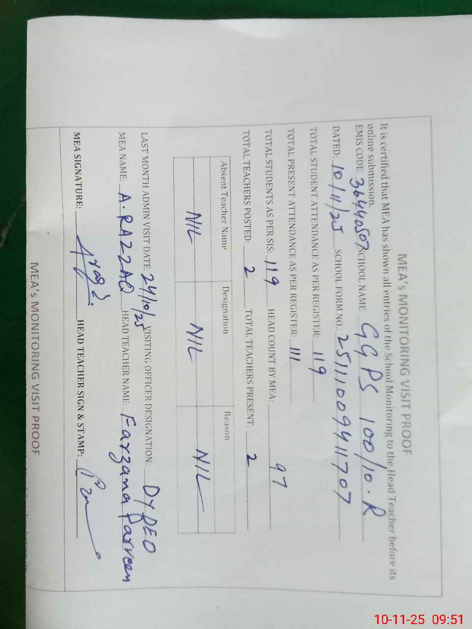 | Monitoring Date: 10-11-2025 | Start Time: 10-11-2025 09:31 AM | End Time: 10-11-2025 09:57 AM | Name of MEA: AB**** RA**** | |