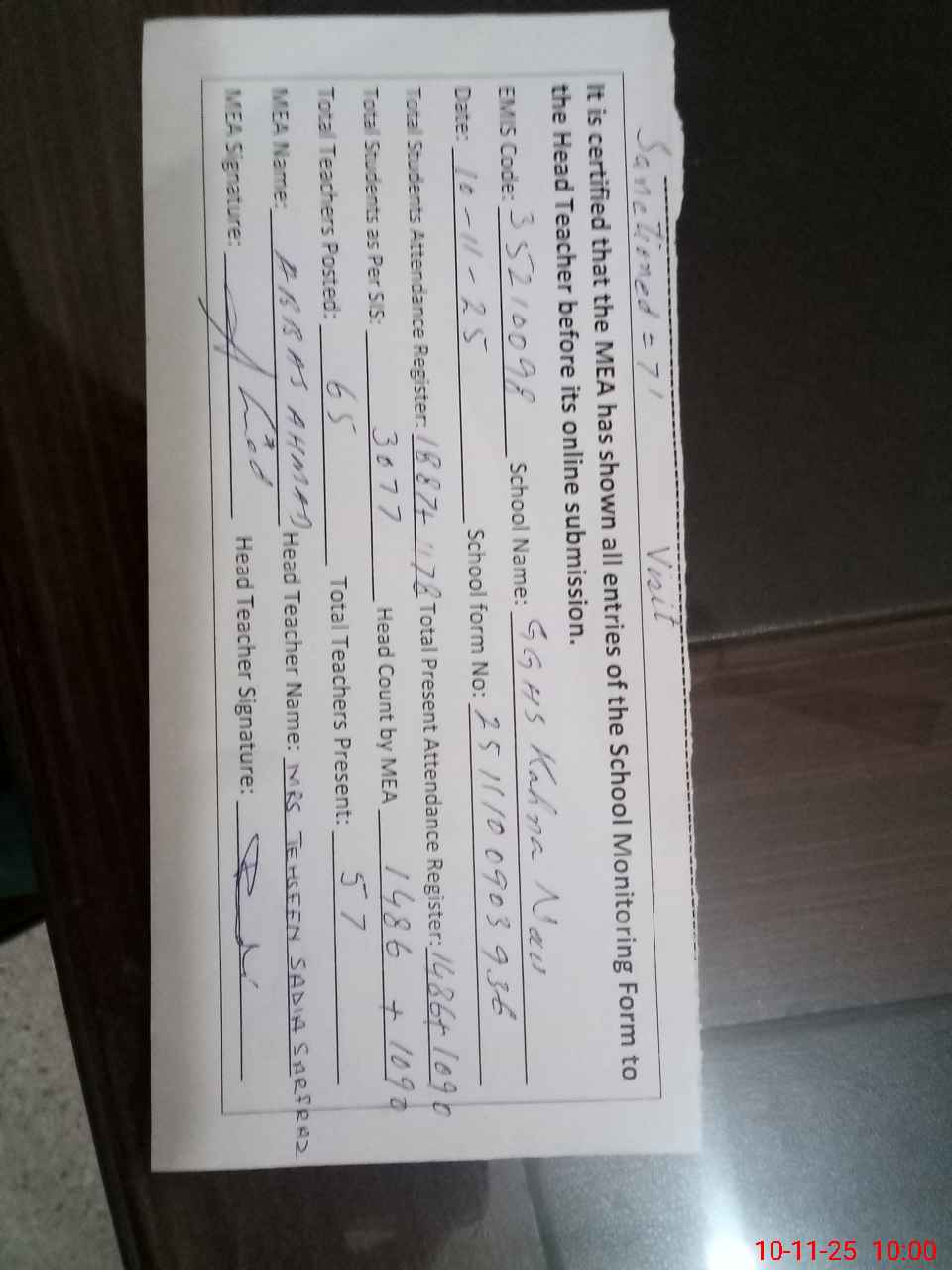 | Attendance Register | Head Teacher | MEA with School | Visit Proof |