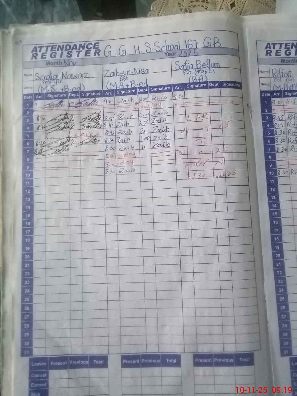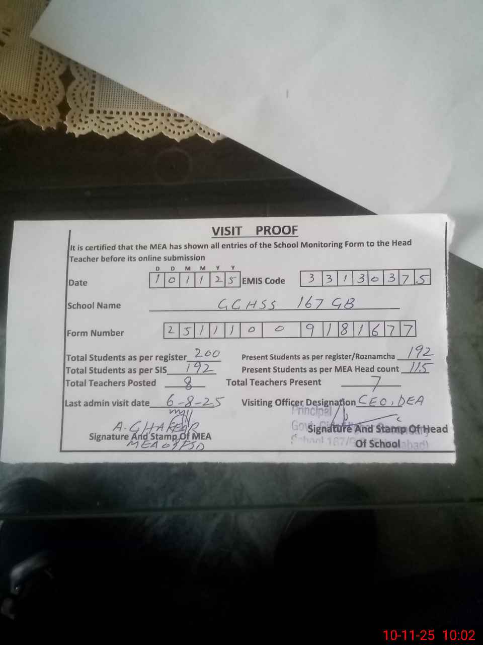 | Remarks (Use Separate Page if Required): PRINCIPAL SADIA NAWAZ SAHIBA FOUND ABSENT FROM SCHOOL NSB BANK STATEMENT FOR THE MONTH OF OCTOBER NOT AVAILABLE IN SCHOOL FTF BANK STATEMENT NOT AVAILABLE FROM AUGUST 2025 TO TILL DATE GROUND IS FULL WITH WATER ELECTRICITY IN CLASS SIX TO EIGHT FOUND UNSAFE IN BATHROOM ELECTRIC WIRE FOUND NAKED UNSAFE COMPLETE WALL NEEDS TO BE REPAIR | |||||