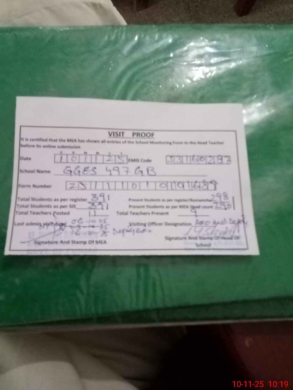 | Attendance Register | Head Teacher | MEA with School | Visit Proof |