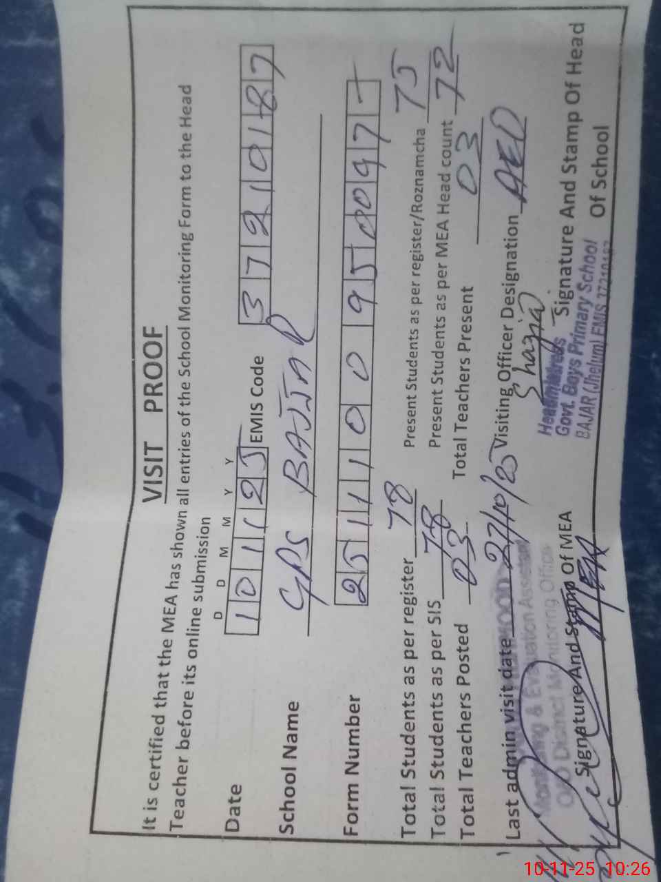 | Attendance Register | Head Teacher | MEA with School | Visit Proof |