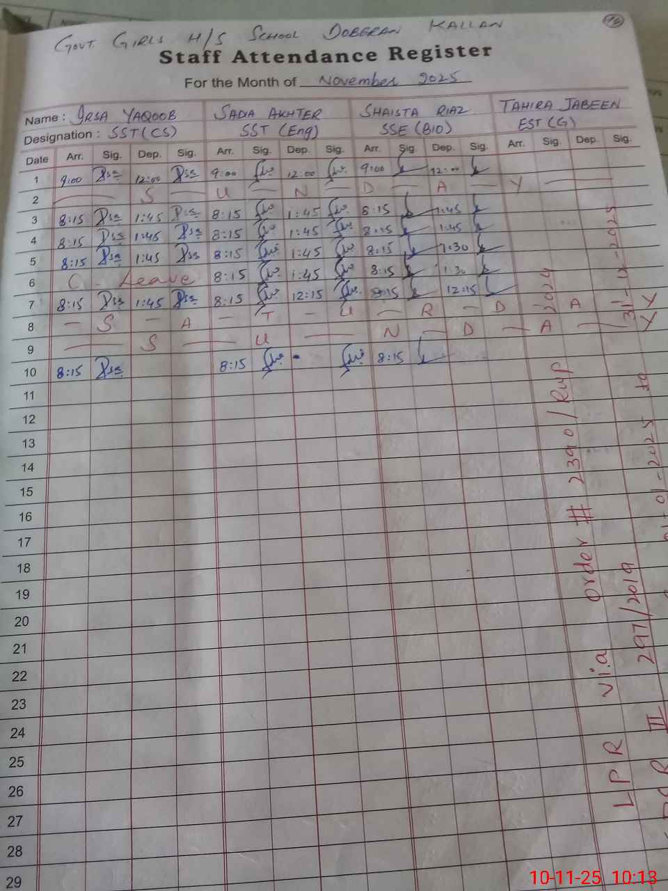 | CNIC | Full Name | Designation | R/C | Absence During Last Calender Month |
