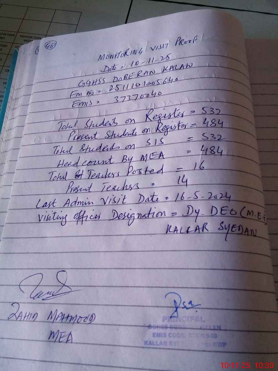 | Certified that this School was Inspected by the Undersigned MEA/DMO Today and the Information Stated Above is as Per Record. | |||||