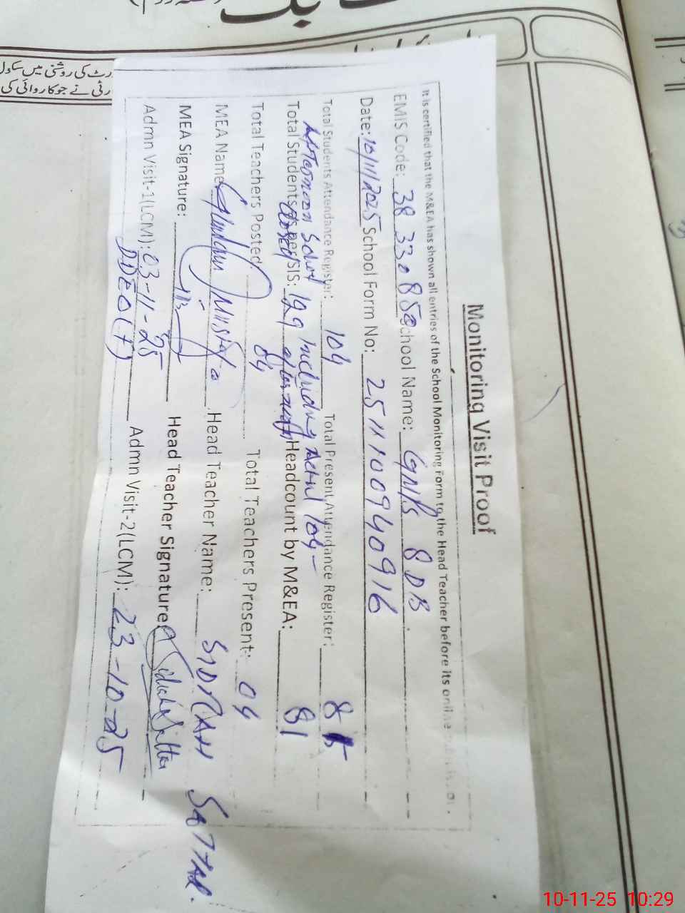 | Attendance Register | Head Teacher | MEA with School | Visit Proof |