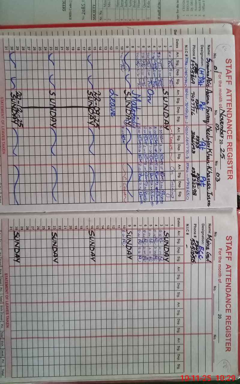 | CNIC | Full Name | Designation | R/C | Absence During Last Calender Month |
