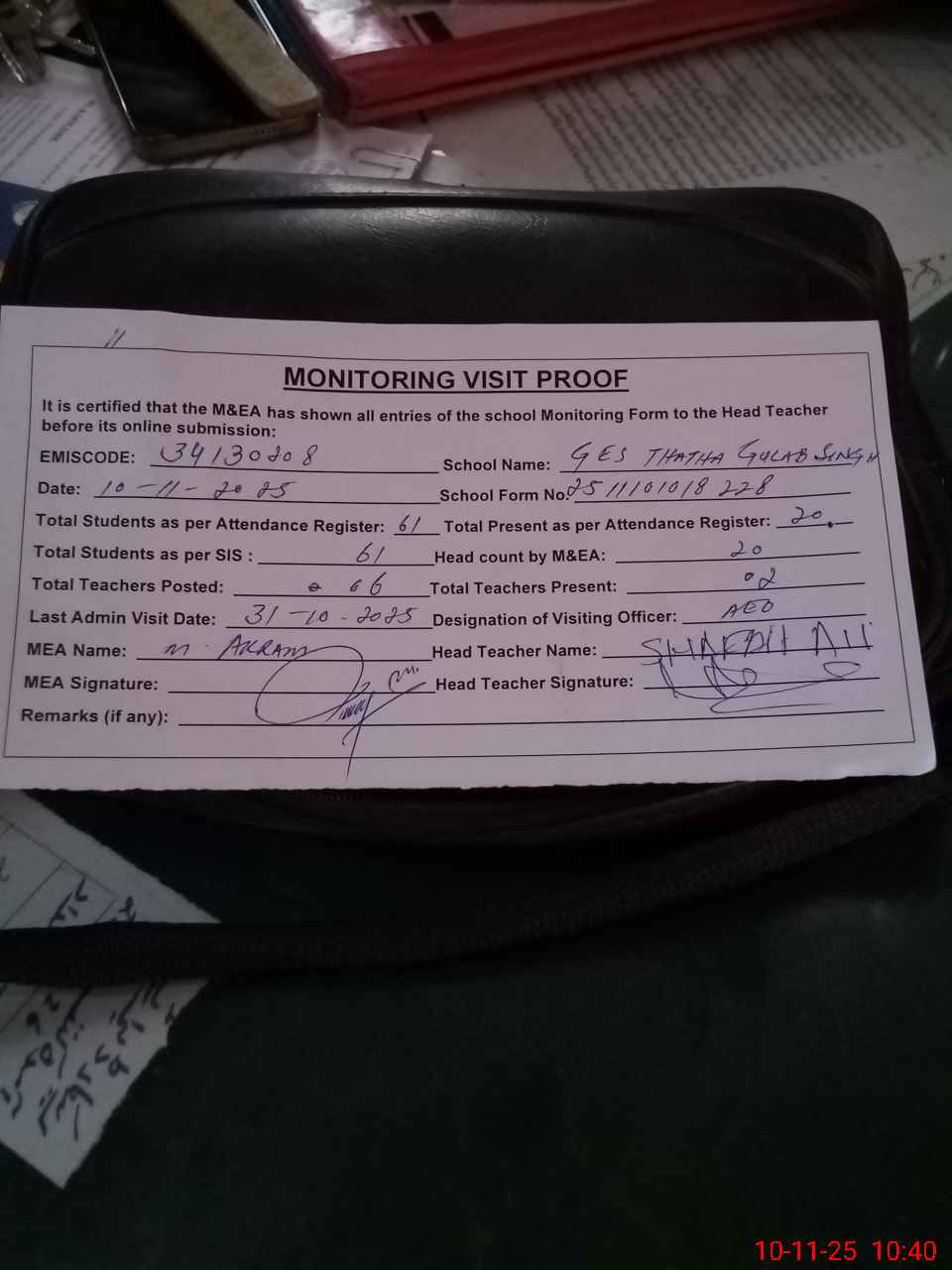 | Attendance Register | Head Teacher | MEA with School | Visit Proof |