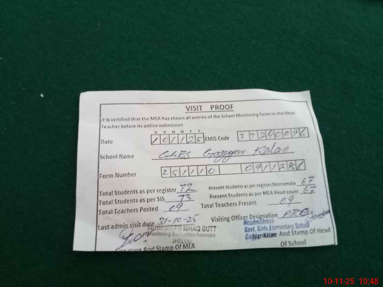| Monitoring Date: 10-11-2025 | Start Time: 10-11-2025 09:11 AM | End Time: 10-11-2025 10:50 AM | Name of MEA: Mu**** Is**** bu**** | |