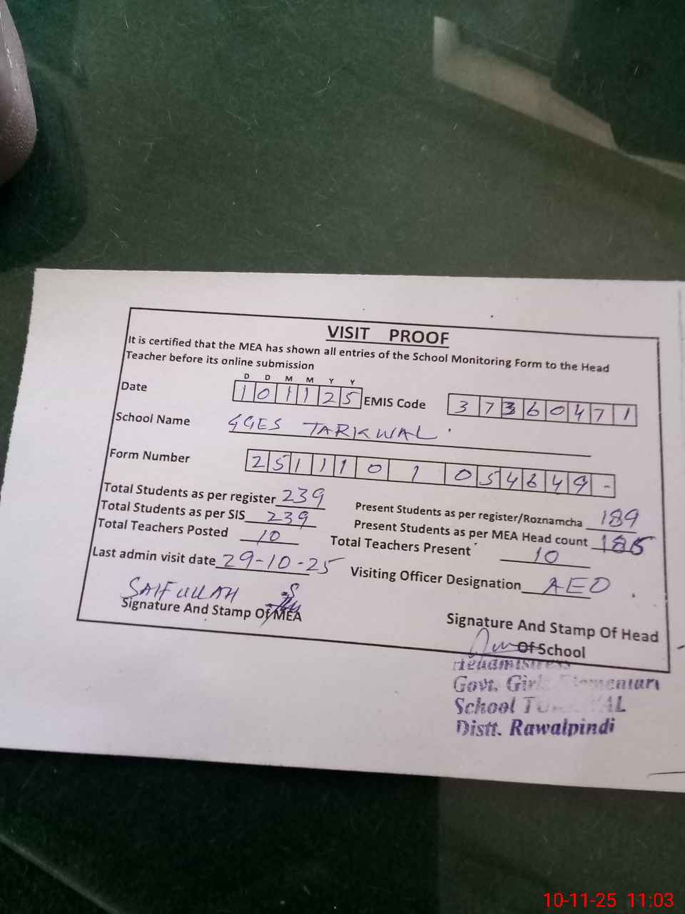 | Attendance Register | Head Teacher | MEA with School | Visit Proof |
