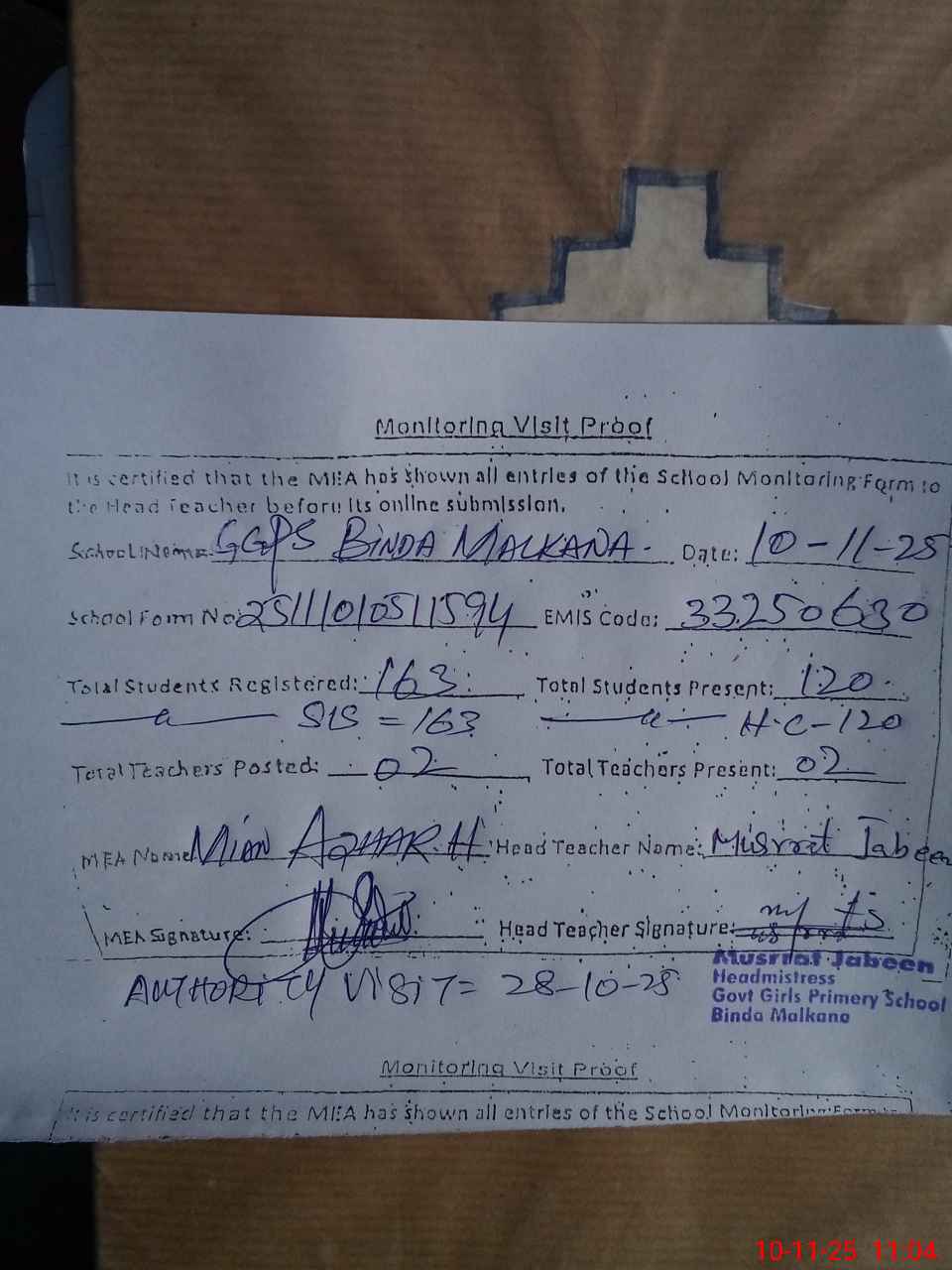 | Attendance Register | Head Teacher | MEA with School | Visit Proof |