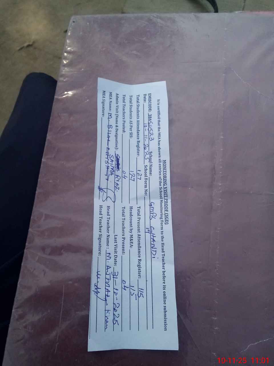 | Attendance Register | Head Teacher | MEA with School | Visit Proof |