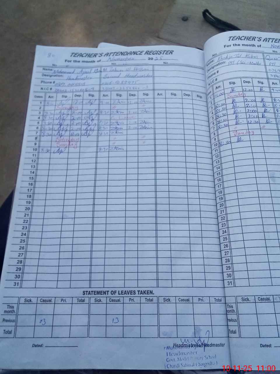 | CNIC | Full Name | Designation | R/C | Absence During Last Calender Month |