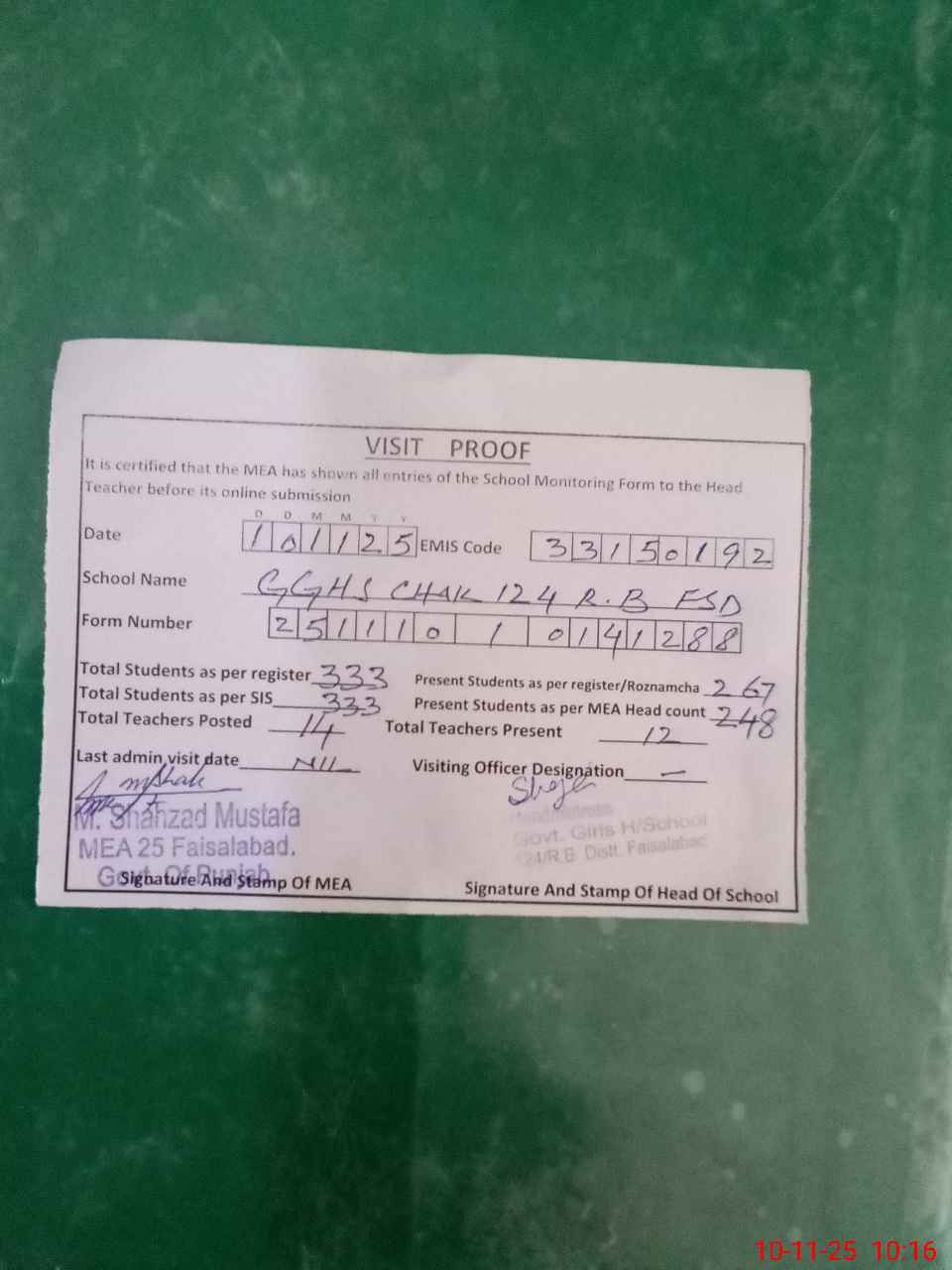 | Monitoring Date: 10-11-2025 | Start Time: 10-11-2025 09:16 AM | End Time: 10-11-2025 10:25 AM | Name of MEA: MU**** SH**** MU**** | |