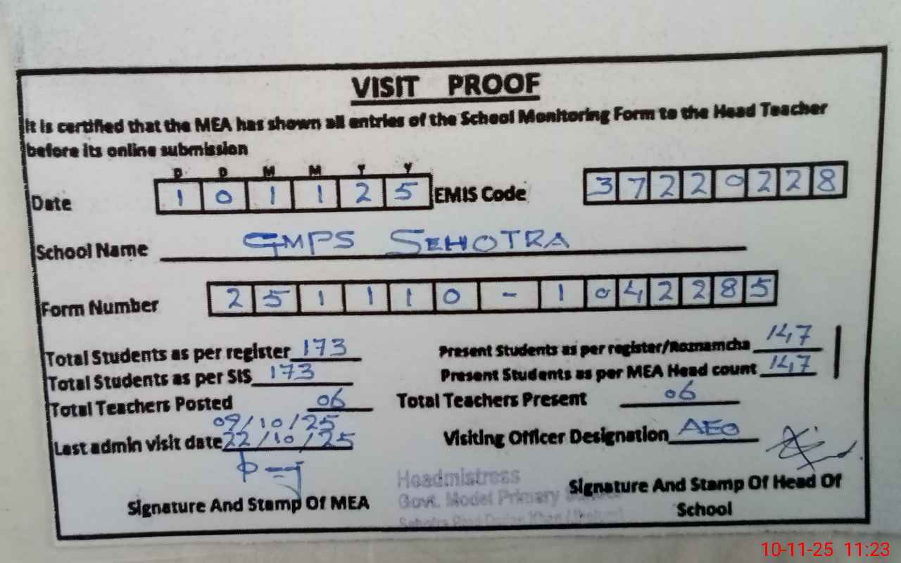 | Attendance Register | Head Teacher | MEA with School | Visit Proof |