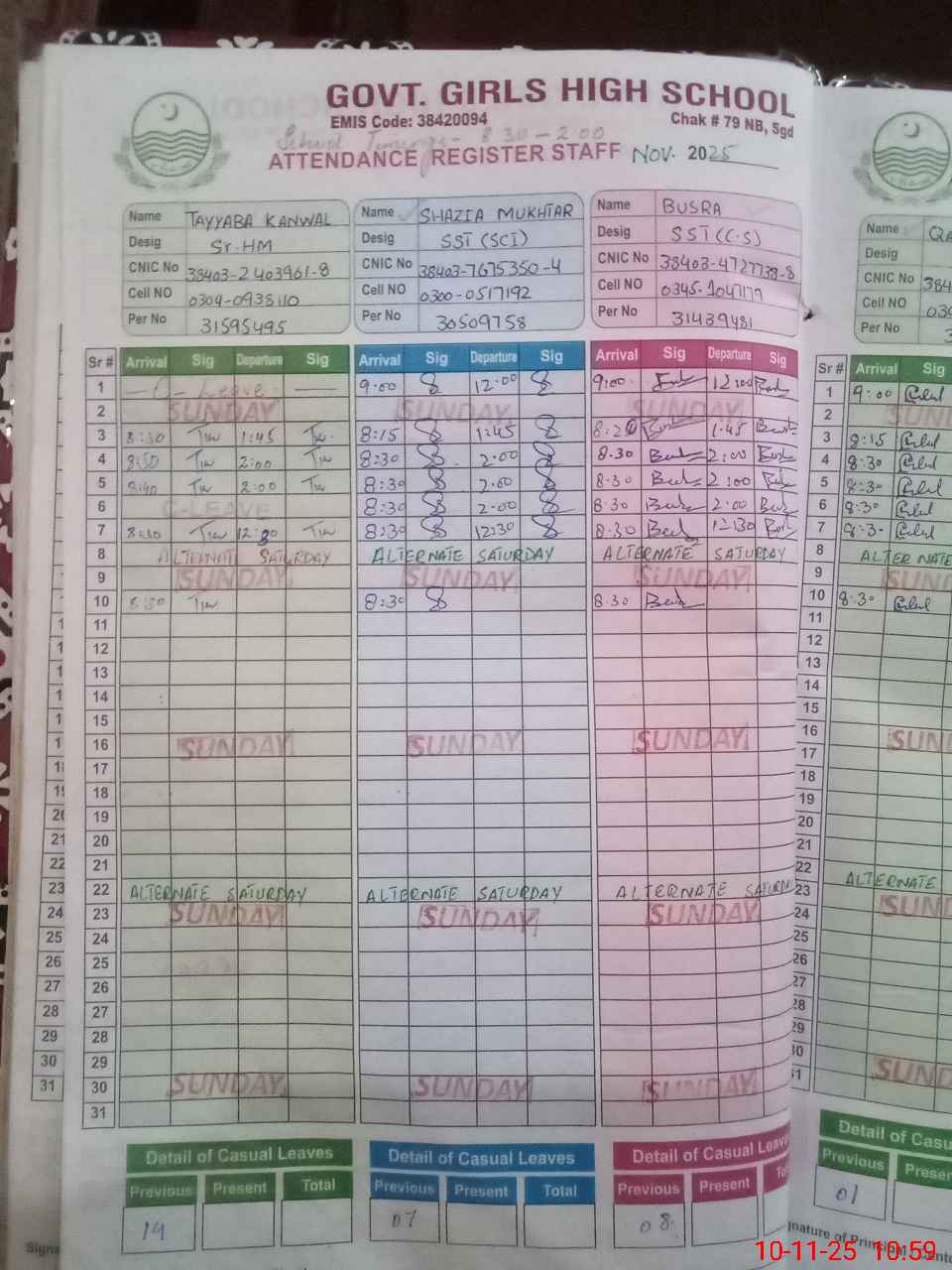 | CNIC | Full Name | Designation | R/C | Absence during last cal. month |