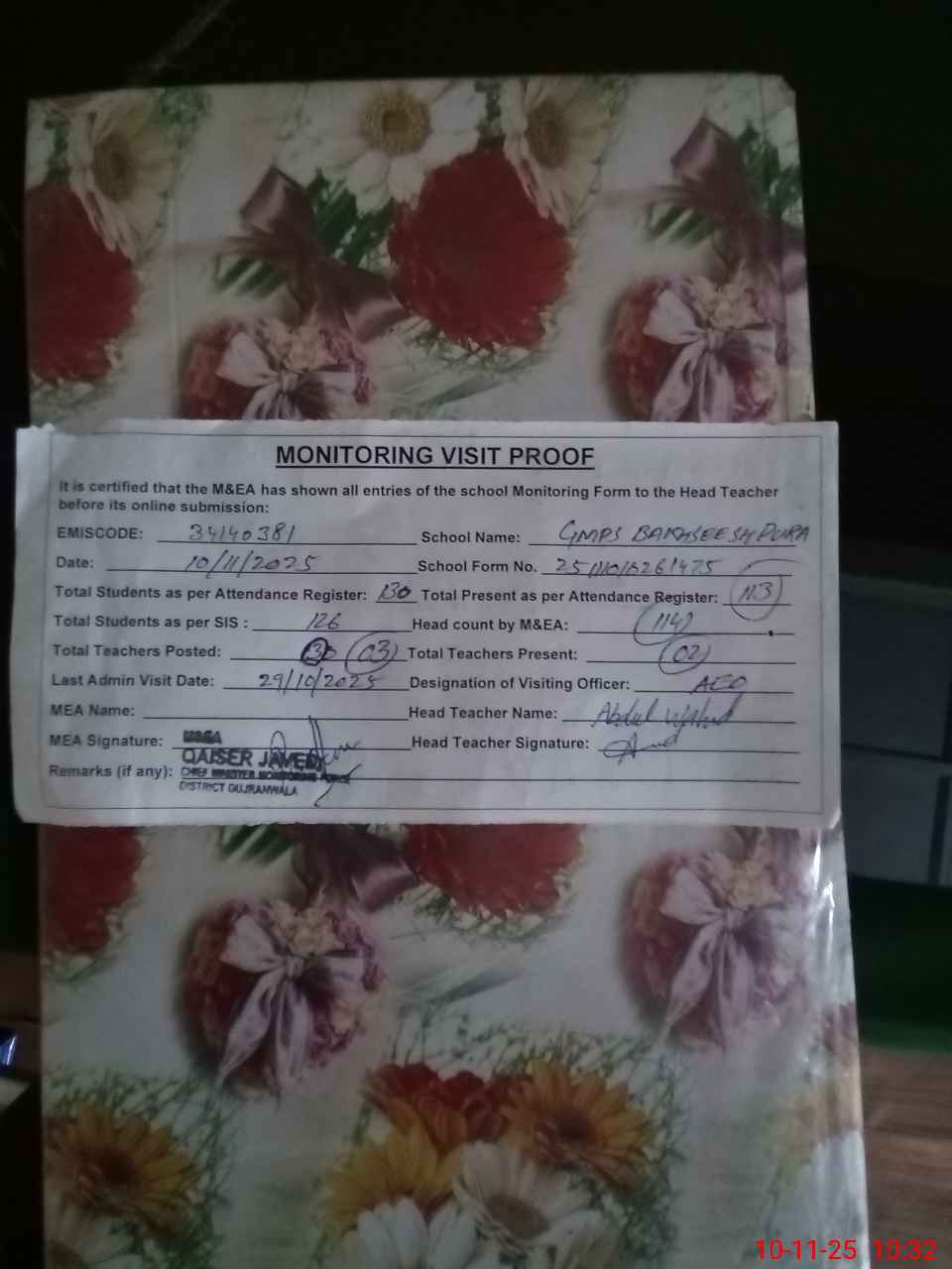 | Attendance Register | Head Teacher | MEA with School | Visit Proof |